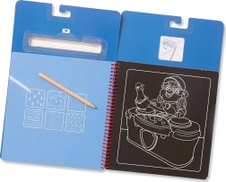 Il suffit de prendre le stylet en bois fourni, de gratter délicatement la couche noire et des images multicolores apparaissent. Les pochoirs et autocollants inclus aident les enfants à créer leurs propres motifs tout en développant leur motricité fine, leur créativité et leur patience.