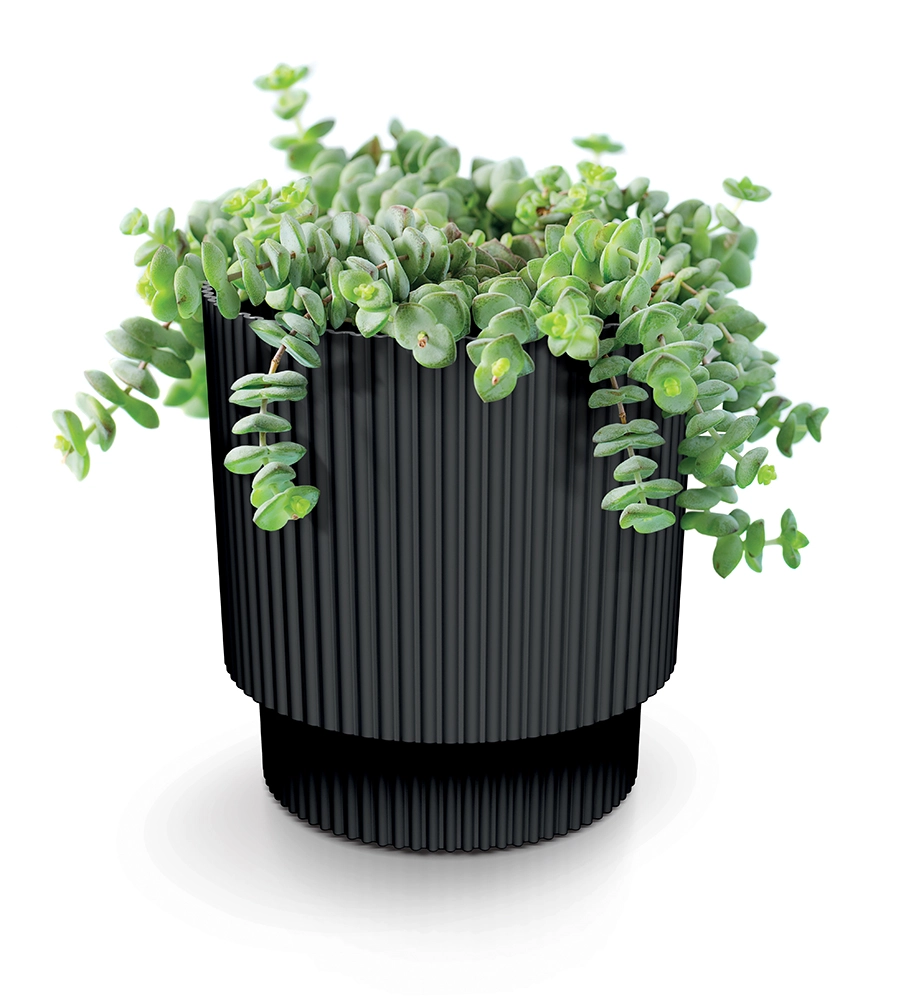 Le cache-pot Milly allie esthétique moderne et fonctionnalités pratiques. De fines rainures verticales apportent un style intemporel tout en améliorant la prise lors du rempotage. La teinte anthracite s’associe facilement à tout type de décoration et met en valeur les couleurs de vos plantes.