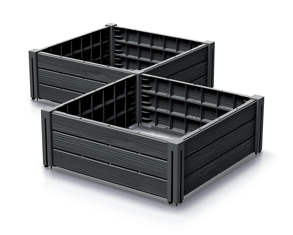 Le plastique résistant avec stabilisation UV défie le soleil, le gel et l’humidité ; les bacs restent stables, sans corrosion ni échardes. Chaque module offre 67 l de volume – idéal pour les tomates, salades, herbes aromatiques et plantes ornementales.
