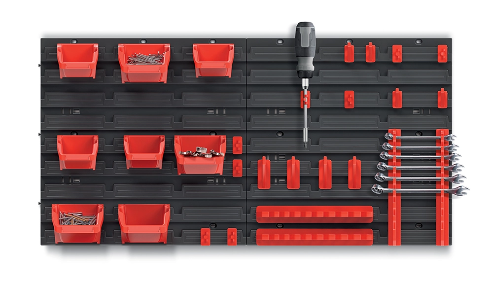 Gardez de l’ordre et un accès rapide à vos outils grâce à ce système mural bien pensé. Le panneau combine des bacs pour les petites fournitures et des crochets pour suspendre les outils, afin que tout soit bien visible au même endroit. Le plastique robuste résiste à un usage quotidien et la finition noir‑rouge apporte un aspect professionnel à votre atelier.