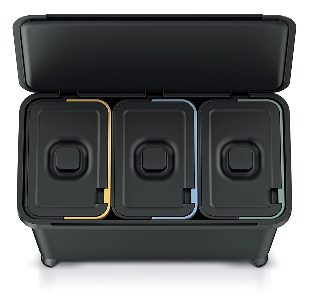 La poubelle SYSTEMA offre une solution réfléchie et esthétique pour le tri des déchets à la maison comme au travail. Trois conteneurs amovibles avec couvercles et marquage coloré accélèrent le tri correct, tandis que les poignées sur les bacs facilitent le vidage. La structure en plastique recyclé noir est résistante, légère et facile à nettoyer.
