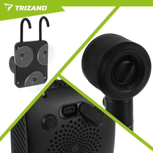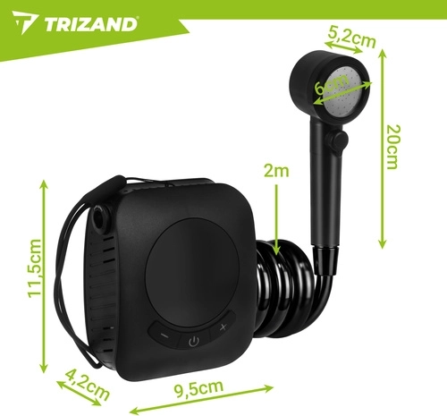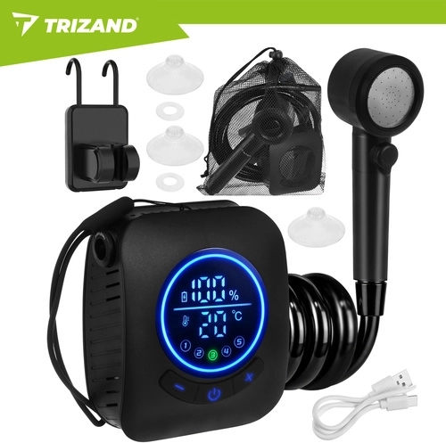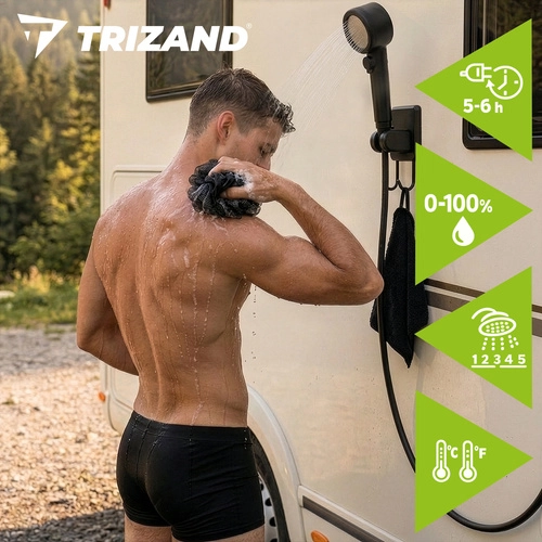 Profitez d’une douche chaude et rafraîchissante où que vous soyez. Cette douche de voyage TRIZAND allie mobilité, performance et simplicité d’utilisation. Grâce à sa puissante batterie permettant jusqu’à 180 minutes d’utilisation et à la régulation fluide de la pression, vous bénéficiez d’un lavage confortable sans accès à un réseau d’eau fixe.