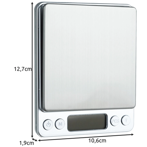 La balance prend en charge plusieurs unités (g/oz/ozt/dwt/ct/gn/tl), dispose de l’arrêt automatique pour économiser les piles et de la pratique fonction TARE pour déduire le poids du récipient. L’emballage comprend 2 coupelles et 2 piles AAA, vous pouvez donc commencer à peser dès le déballage.