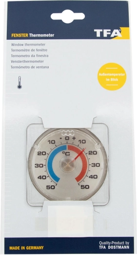 Thermomètre de fenêtre pratique pour une utilisation extérieure avec échelle lisible et pastille autocollante pour une installation facile. Offre une plage de mesure de -50 à +50 °C, des dimensions compactes de 7×7 cm et une construction légère en plastique pour une longue durée de vie.