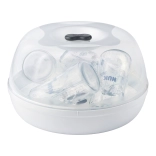 Le stérilisateur ne comporte que trois pièces, il se monte et se nettoie très facilement – après usage, il suffit de l’essuyer ou de le placer au lave-vaisselle. Il convient à la plupart des fours à micro-ondes standards avec un espace intérieur minimal de 187 mm (hauteur) × 280 mm (largeur et profondeur). Compatible avec les biberons et accessoires en matériaux adaptés au micro-ondes (les biberons en PA et les tétines en PA ne conviennent pas).