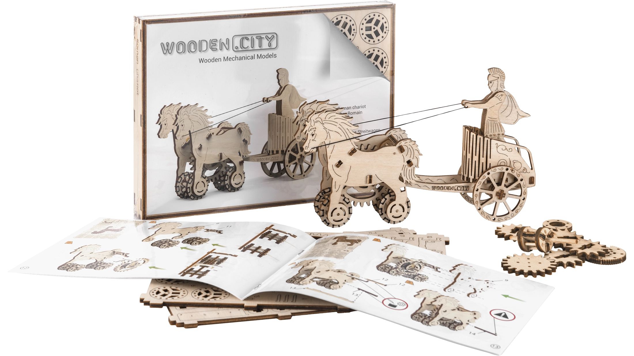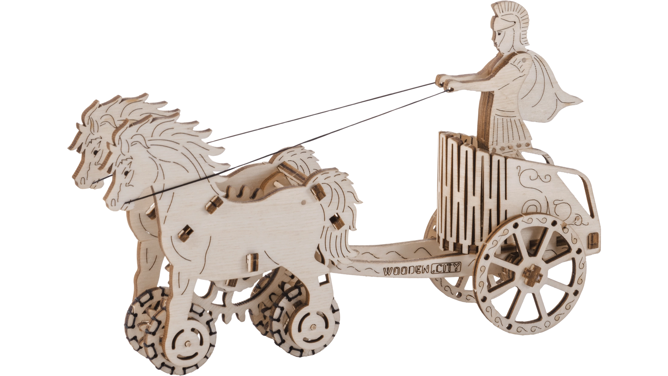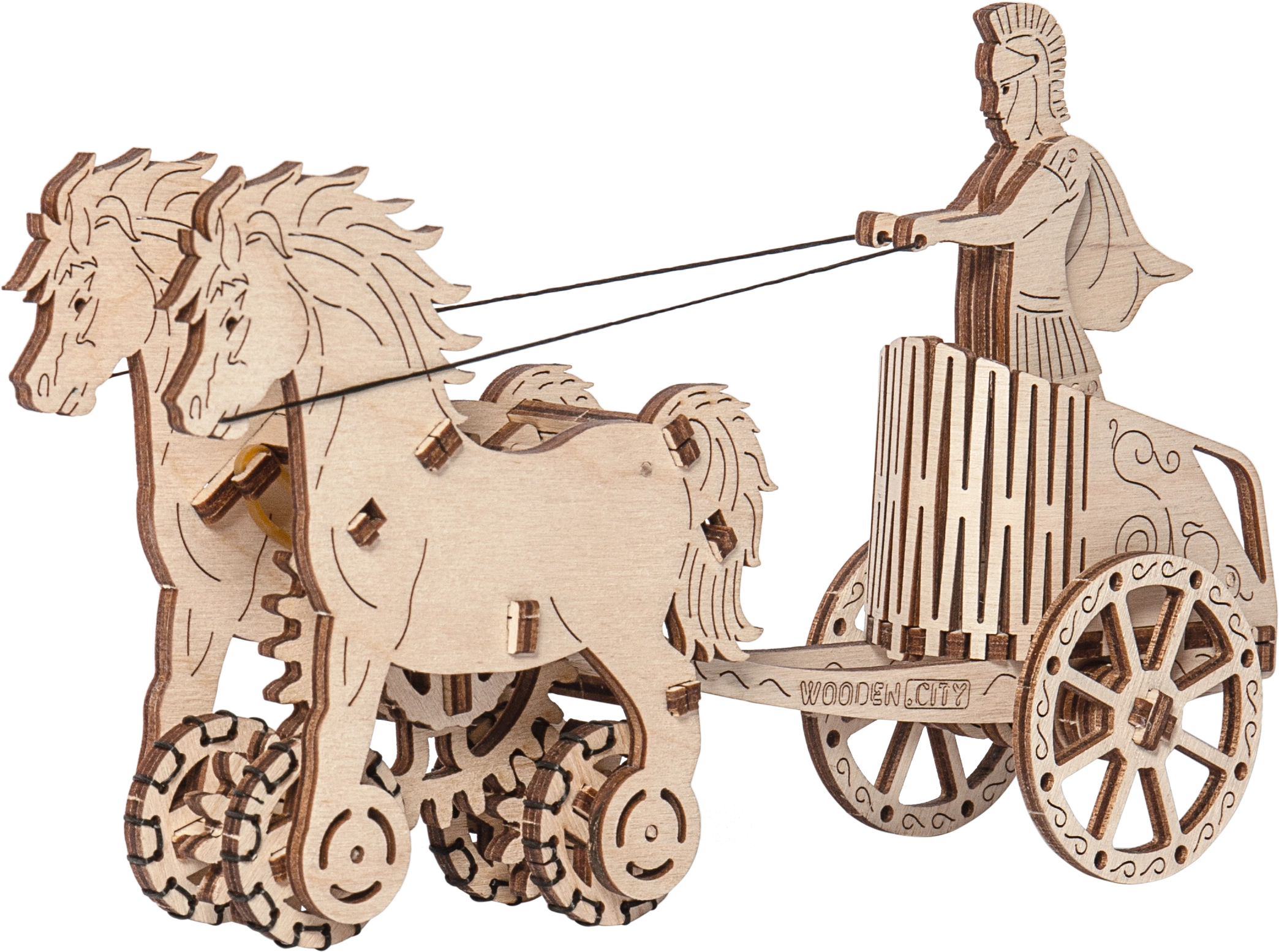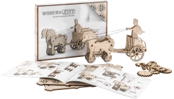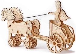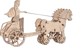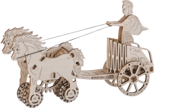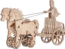 Au nom de l’Empire. Maquette de char romain à attelage double, fabriquée en contreplaqué. Dans un char fidèlement reproduit se trouve une figurine détaillée d’un cavalier romain. Grâce à un mécanisme à remonter, le modèle peut se déplacer et, au démarrage, l’attelage se cabre avant de parcourir jusqu’à 1 mètre. Organisez des courses avec d’autres modèles Wooden City ! Livré avec un manuel de montage détaillé. Principales caractéristiques : 74 pièces finement découpées, faible difficulté d’assemblage, le modèle final peut se déplacer de manière autonome.