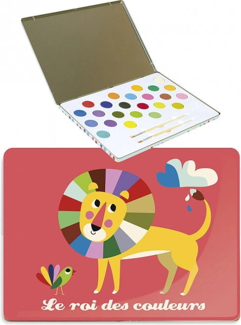 Grand set de peintures acryliques dans une boîte métallique, idéal pour les activités créatives des enfants comme des adultes.