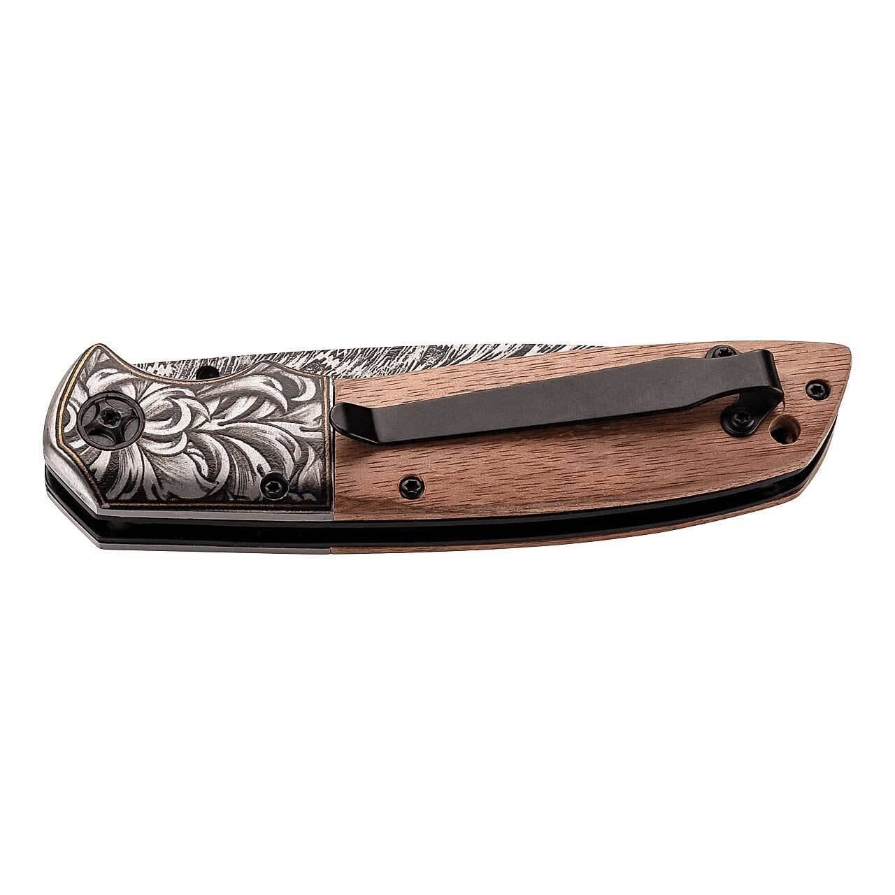 Élégant couteau de poche HERBERTZ pour un usage quotidien ou comme cadeau stylé. Il offre une lame en acier inoxydable AISI 420 avec motif floral gravé, une ouverture au pouce pratique et un verrouillage Linerlock sécurisé. Le manche en bois de noyer tient parfaitement en main, avec un clip de poche pour port à droite et un trou pour cordon.