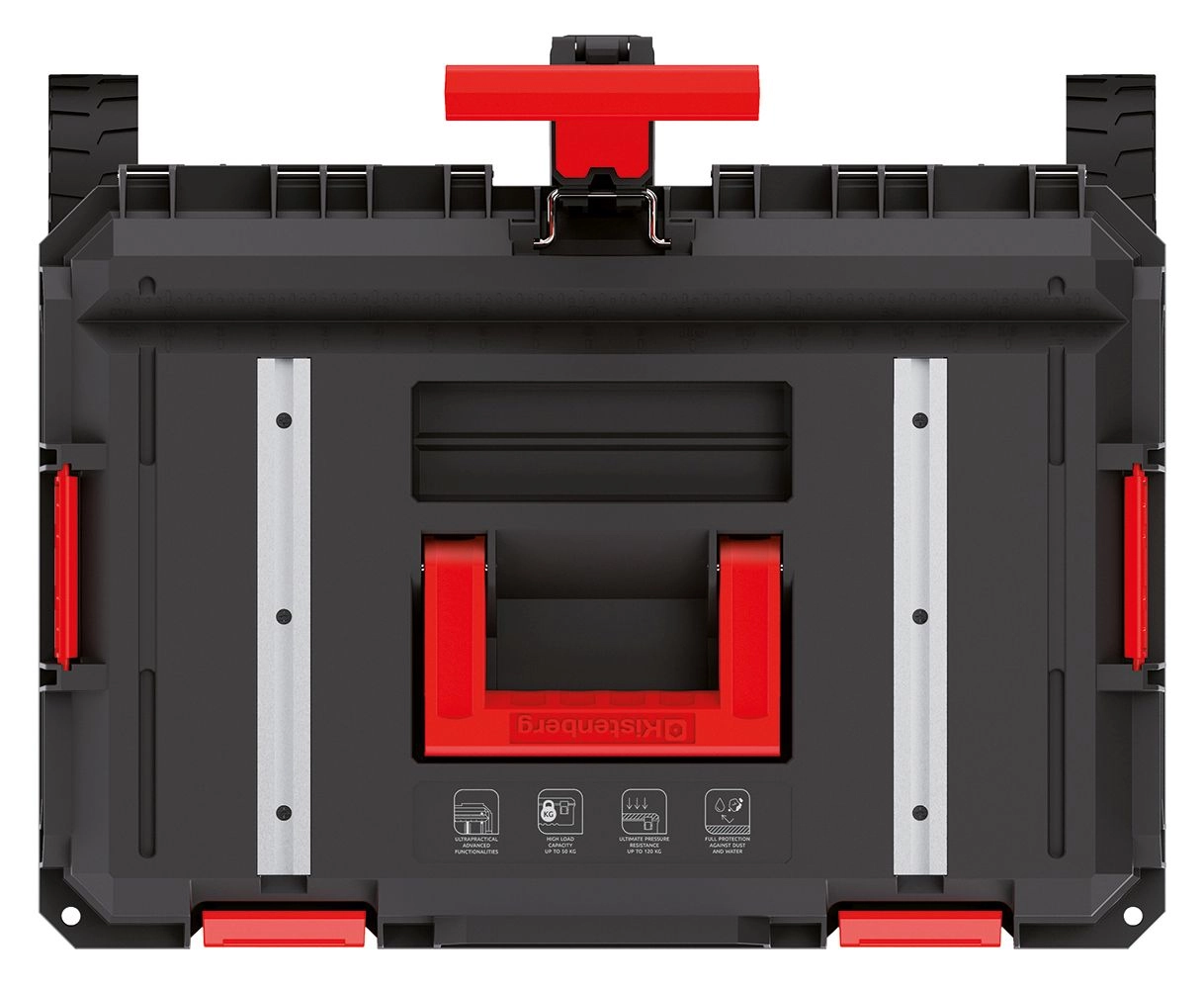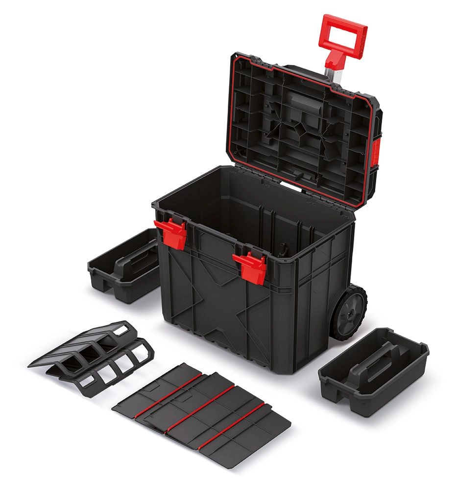 La boîte roulante X-Block Tech combine une construction solide, une organisation ingénieuse et un transport aisé. Des parois nervurées, des coins renforcés et des verrous de qualité protègent le contenu même en environnement poussiéreux ou humide. Grâce à la poignée télescopique et aux grandes roues résistantes, vous déplacez vos outils en toute sécurité dans l’atelier comme sur le chantier.