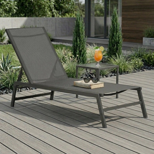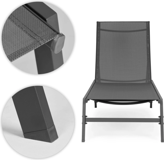 Profitez du confort et du style lors de vos moments de détente au jardin, sur la terrasse ou au bord de la piscine. Cette chaise longue grise allie design minimaliste, longue durée de vie et entretien facile. La maille respirante sèche rapidement et s’adapte au corps, tandis que le cadre en acier avec revêtement poudre garantit une excellente résistance aux intempéries.