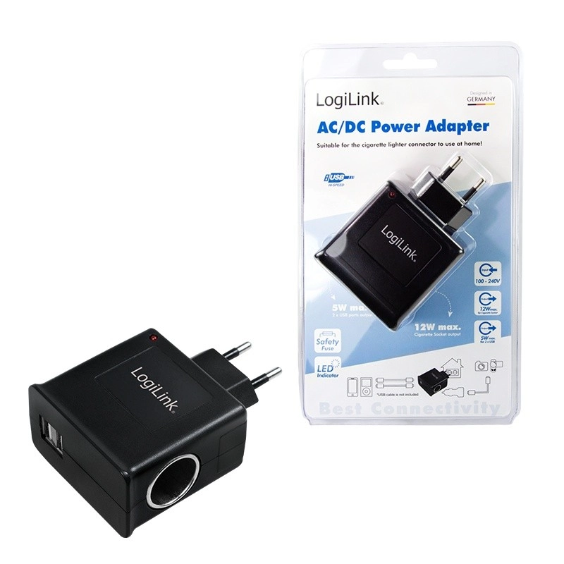 Adaptateur secteur pratique de LOGILINK pour alimenter les accessoires automobiles à la maison. Il offre une prise allume-cigare 12 V (max. 1 A) et une sortie USB 5 V/1 A. Grâce à l’entrée 100–240 V, à la protection contre les surtensions et les courts-circuits et à son format compact, il est idéal pour alimenter vos appareils en toute sécurité et commodité.