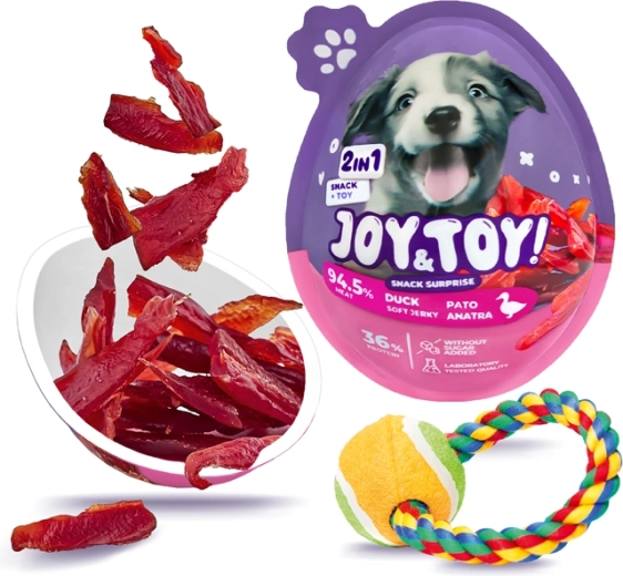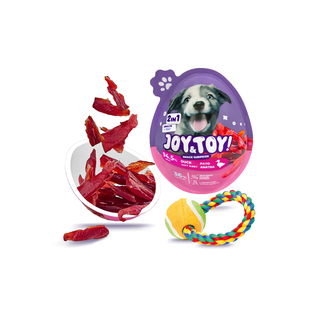Découvrez le plaisir et la récompense en un seul produit : l’œuf Joy&Toy renferme un jerky de canard moelleux et un jouet surprise pour votre chien. Le snack est composé de 94,5 % de filet de canard, séché par un processus délicat, sans colorants, sucre ni exhausteurs de goût. Chaque emballage contient un modèle de jouet différent – plus de 100 possibilités pour un jeu actif et plein de joie.