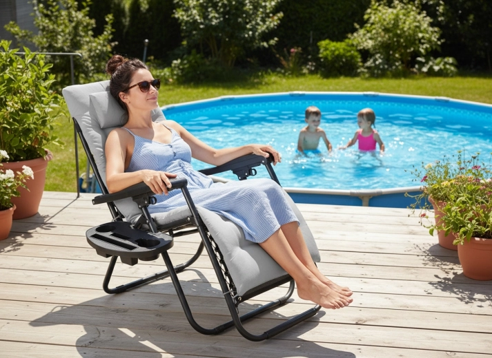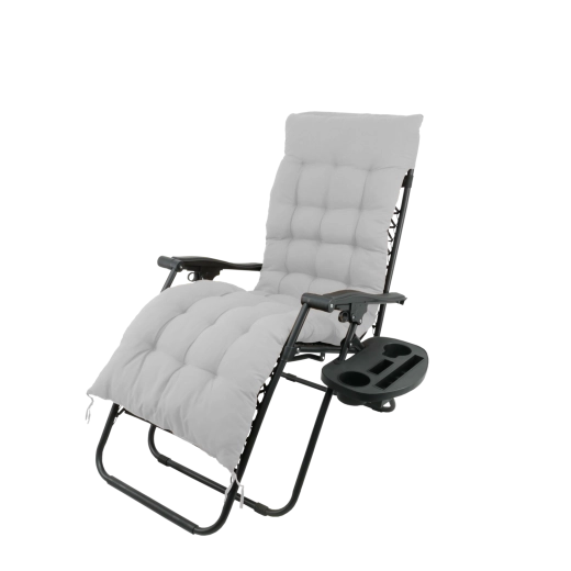 Élégante chaise longue de relaxation combinant un cadre en acier résistant, un tissu respirant 1x2 Textilene et un coussin gris moelleux. Réglez aisément la position de couchage optimale et, grâce au mécanisme pliant, transportez et rangez la chaise en toute simplicité. La tablette de rangement près du dossier accueille boisson, téléphone ou petits objets pour tout avoir à portée.