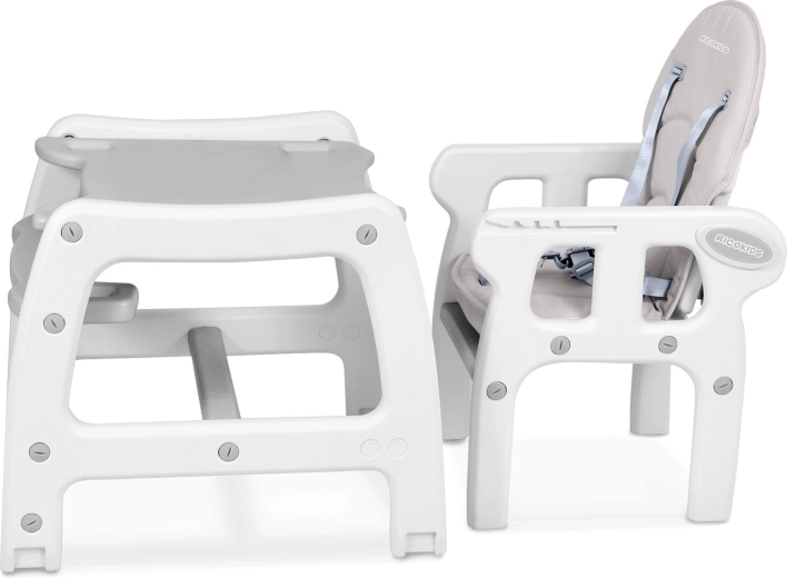 Un seul ensemble, cinq fonctions : chaise haute avec ou sans plateau, chaise basse, table séparée avec chaise. Elle s’adapte à chaque moment de la journée et à l’âge de l’enfant.