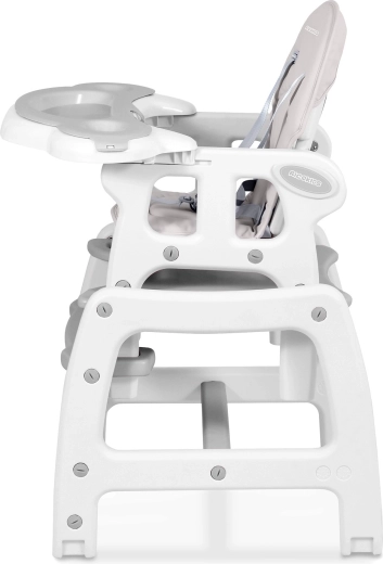 La chaise propose 5 configurations pratiques : chaise haute avec plateau, chaise haute sans plateau, chaise basse, chaise séparée avec table et variante pour les enfants plus grands. Le réglage de l’inclinaison du dossier à 3 niveaux améliore le confort, tandis que le double plateau amovible à bords surélevés et les logements pour gobelets aident à éviter les renversements de boissons.