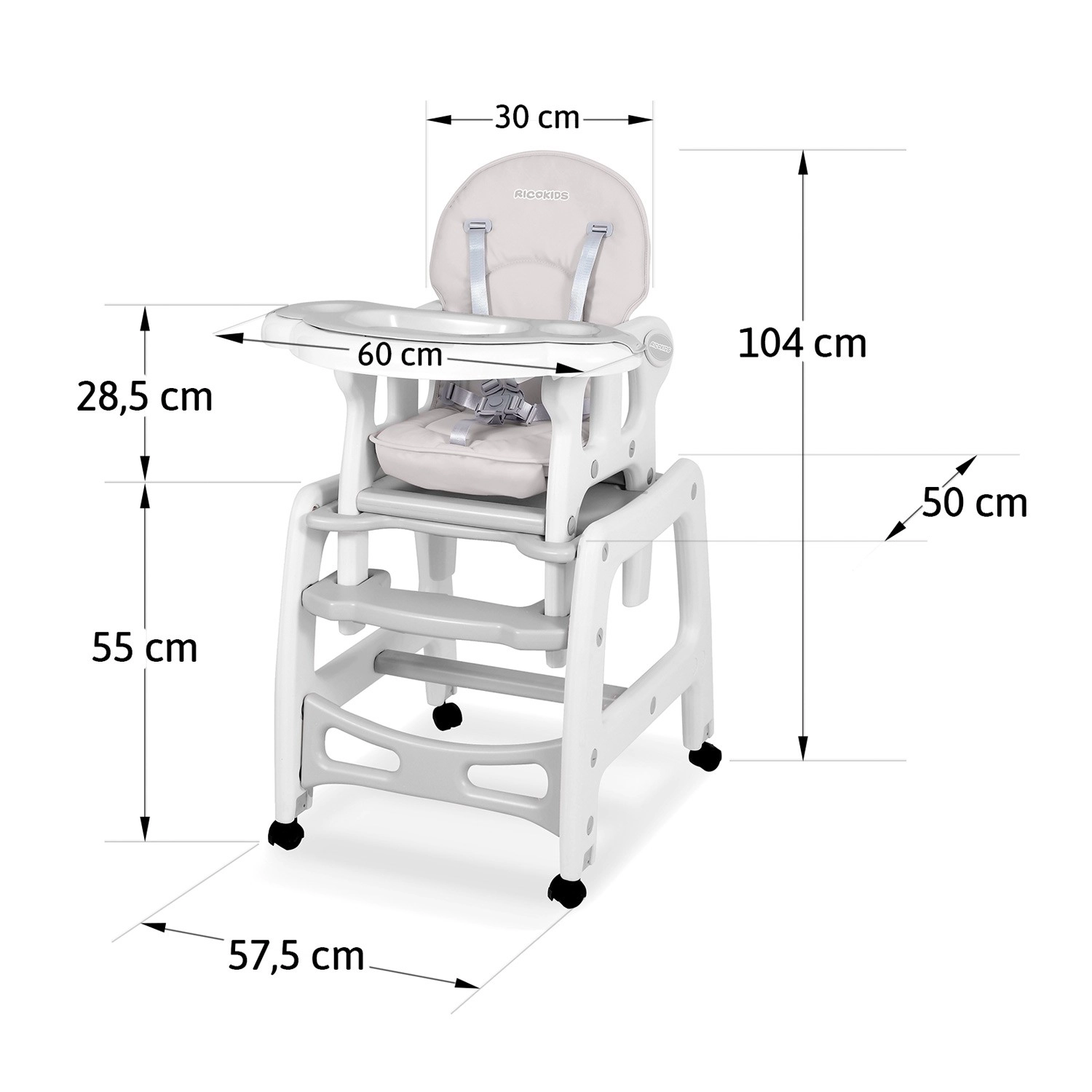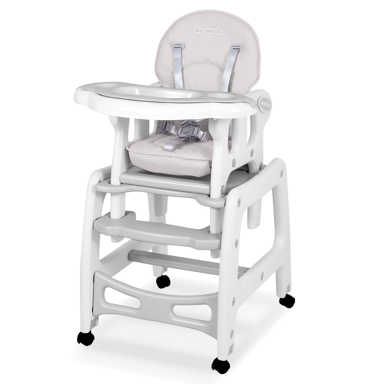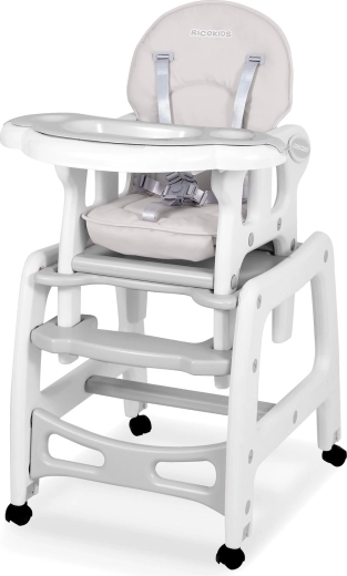 RICOKIDS Sinco est une chaise haute pour enfant moderne et sûre, qui s’adapte aux rituels quotidiens de repas, de jeu et d’apprentissage. Grâce à sa structure robuste, à ses harnais 5 points et à ses roulettes avec option de blocage, elle offre stabilité à l’enfant et confort aux parents. L’assise large et moelleuse avec revêtement façon cuir se nettoie facilement – essuyez les salissures avec un chiffon ou rincez le plateau sous l’eau courante.