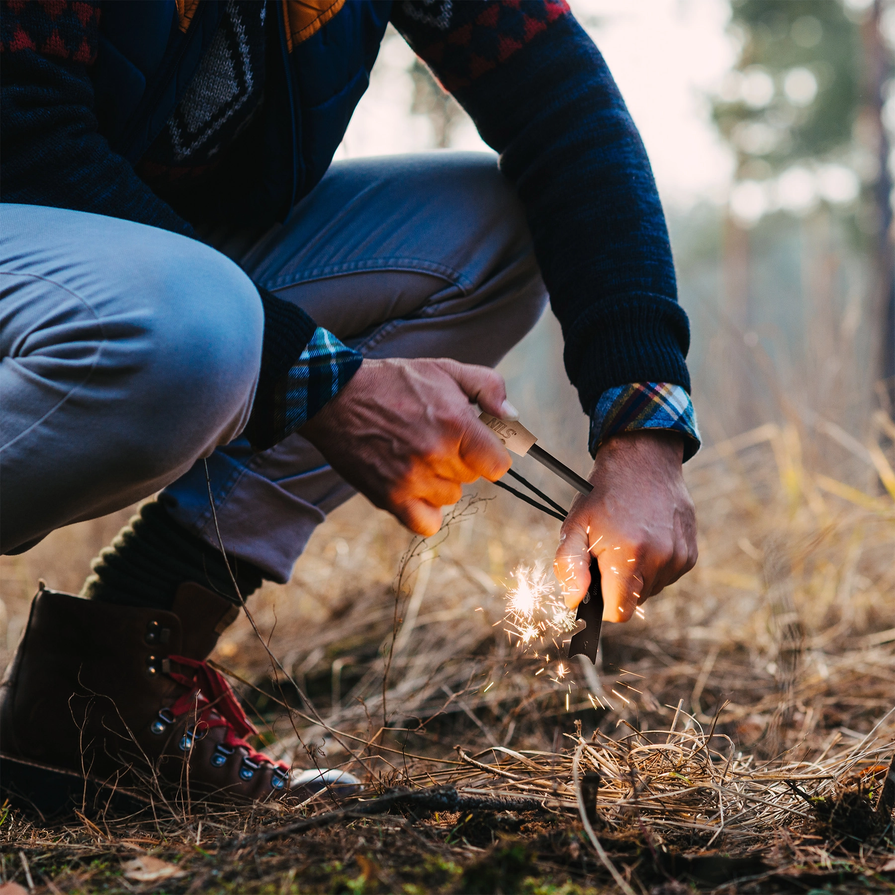La tige en magnésium génère des étincelles extrêmement chaudes (jusqu’à 3 500 °C) qui enflamment de manière fiable l’amadou, l’écorce de bouleau ou l’herbe sèche, même dans des conditions exigeantes.