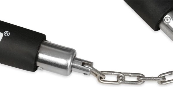 La fixation à roulements des rouleaux en acier, combinée à la chaîne soudée, assure une rotation fluide et une longue durée de vie même en usage intensif. Des dimensions équilibrées et un poids léger de 280 g facilitent la prise en main, les transitions rapides et l’exécution précise des frappes ou des blocages.