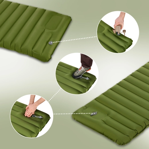 La pompe intégrée à action du pied/main permet de gonfler le matelas sans effort et sans équipement supplémentaire. Une pompe externe peut également être raccordée via la valve.