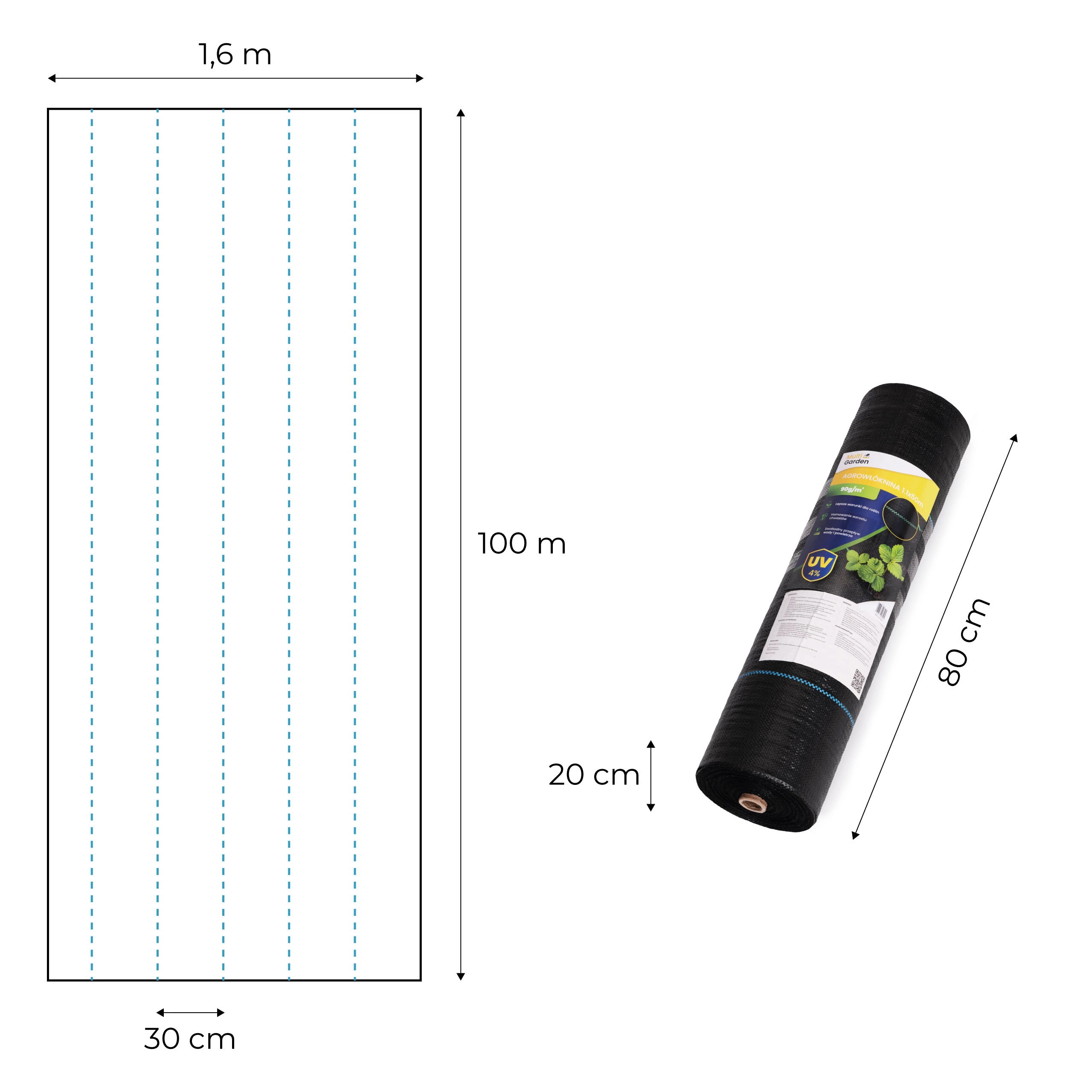 Géotextile de paillage anti-UV 90 g/m² 1,6×100 m avec piquets, MultiGarden