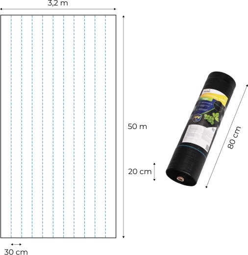 Les lignes de guidage bleues tous les 30 cm accélèrent la planification de la plantation et maintiennent des espacements réguliers. Le textile convient sous l’écorce, le gravier ou les pierres décoratives, pour les massifs ornementaux, planches potagères, sous les arbustes, thuyas, arbres fruitiers et sur les allées de jardin.