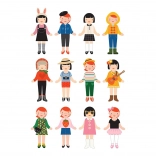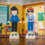 Set de poupées à habiller dans une boîte fermée par un aimant, offrant aux enfants jusqu’à 80 combinaisons créatives de tenues modernes grâce à 27 pièces magnétiques.