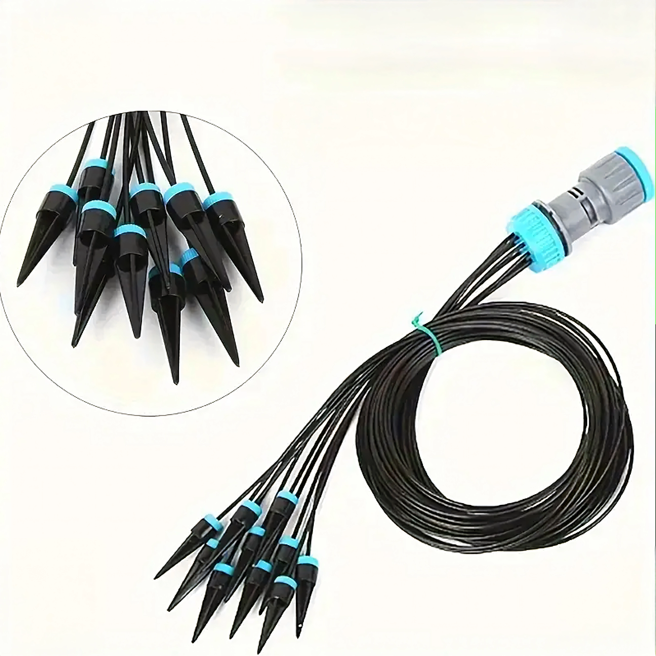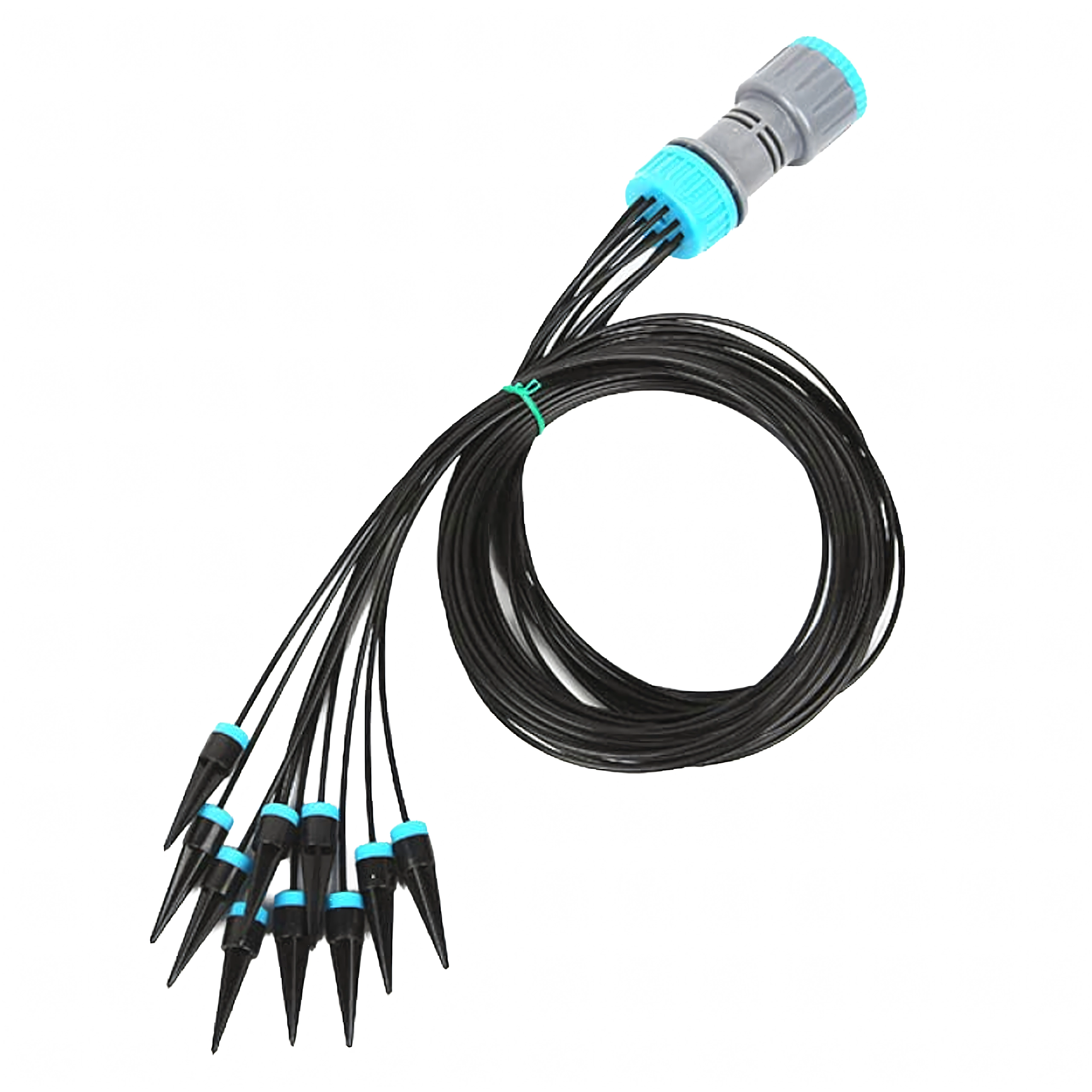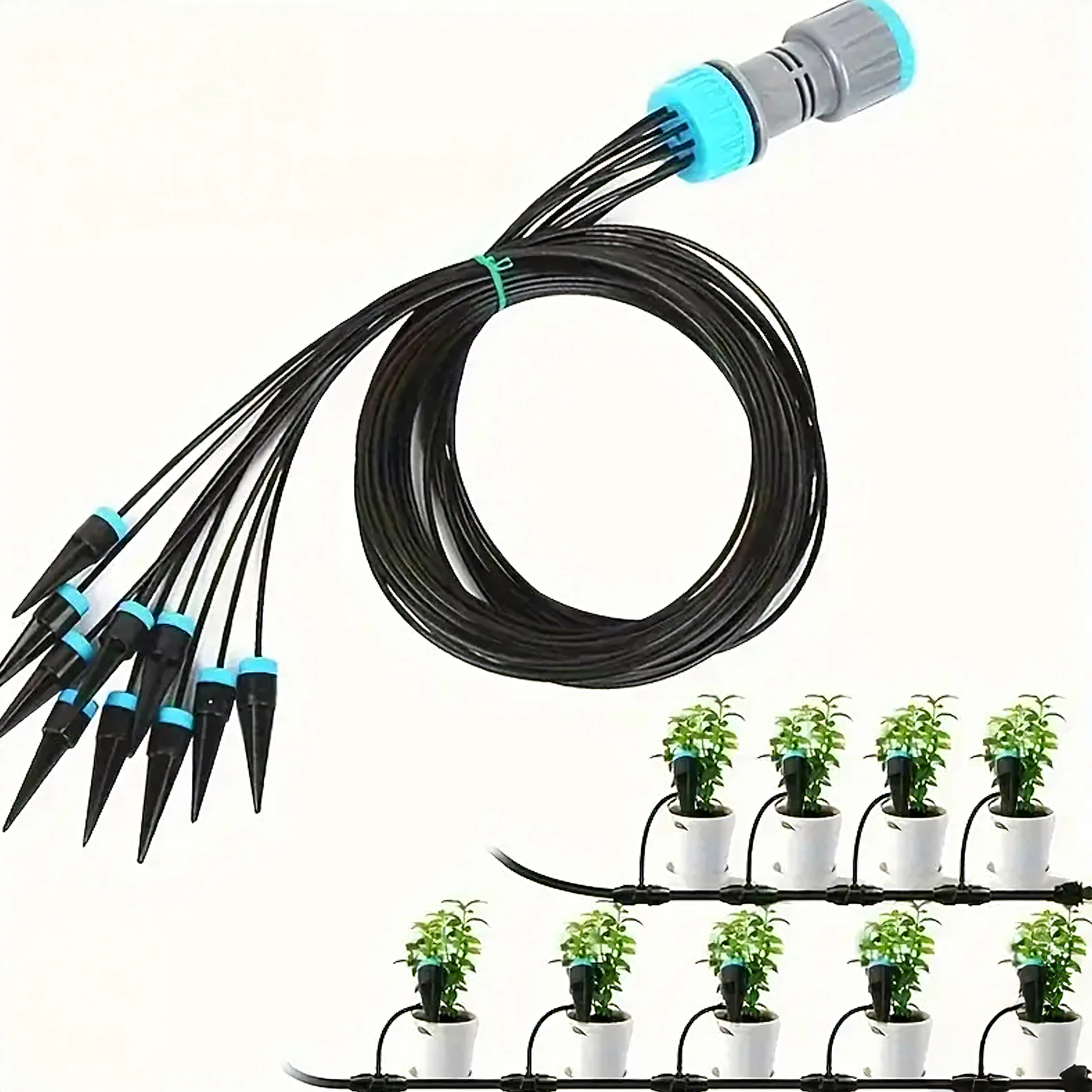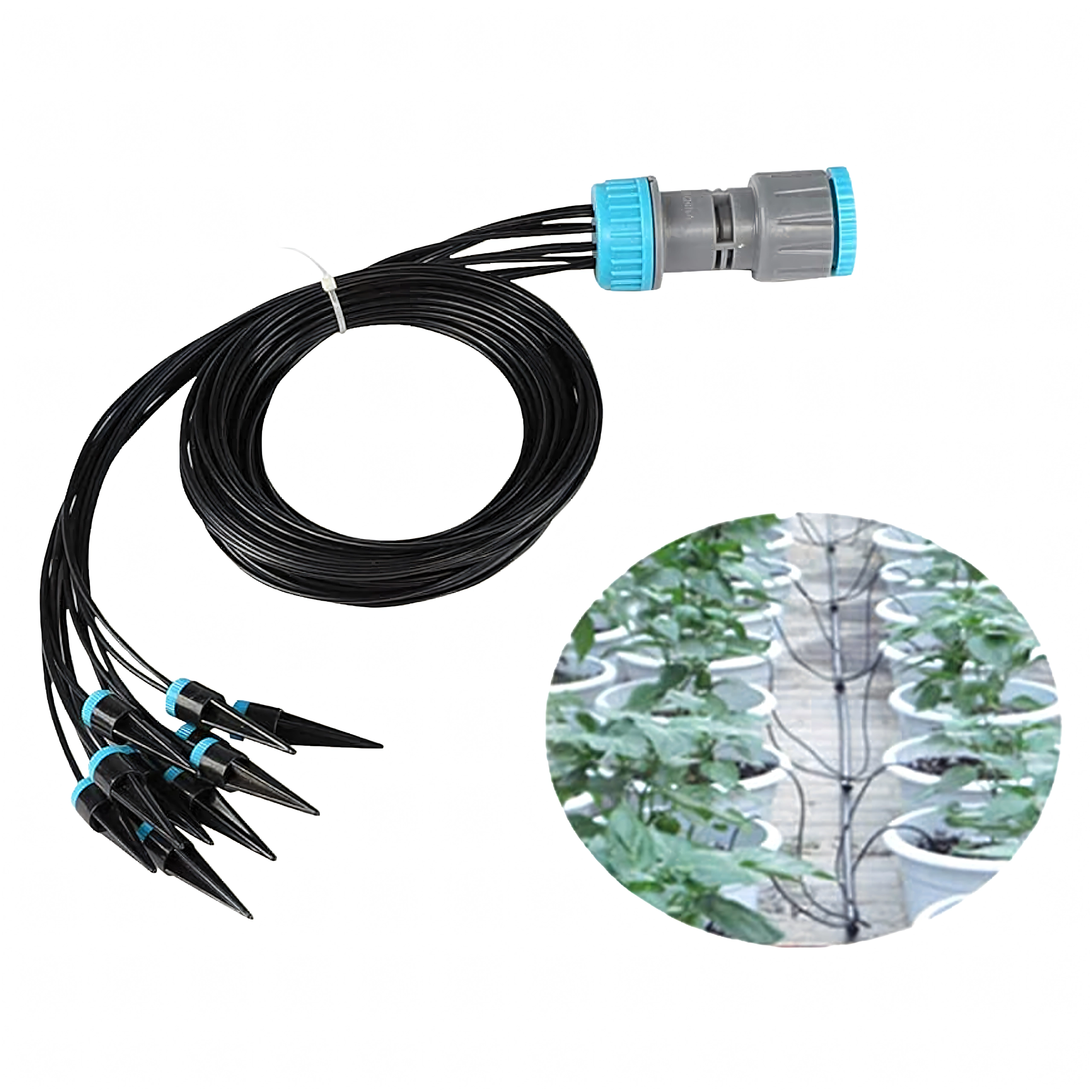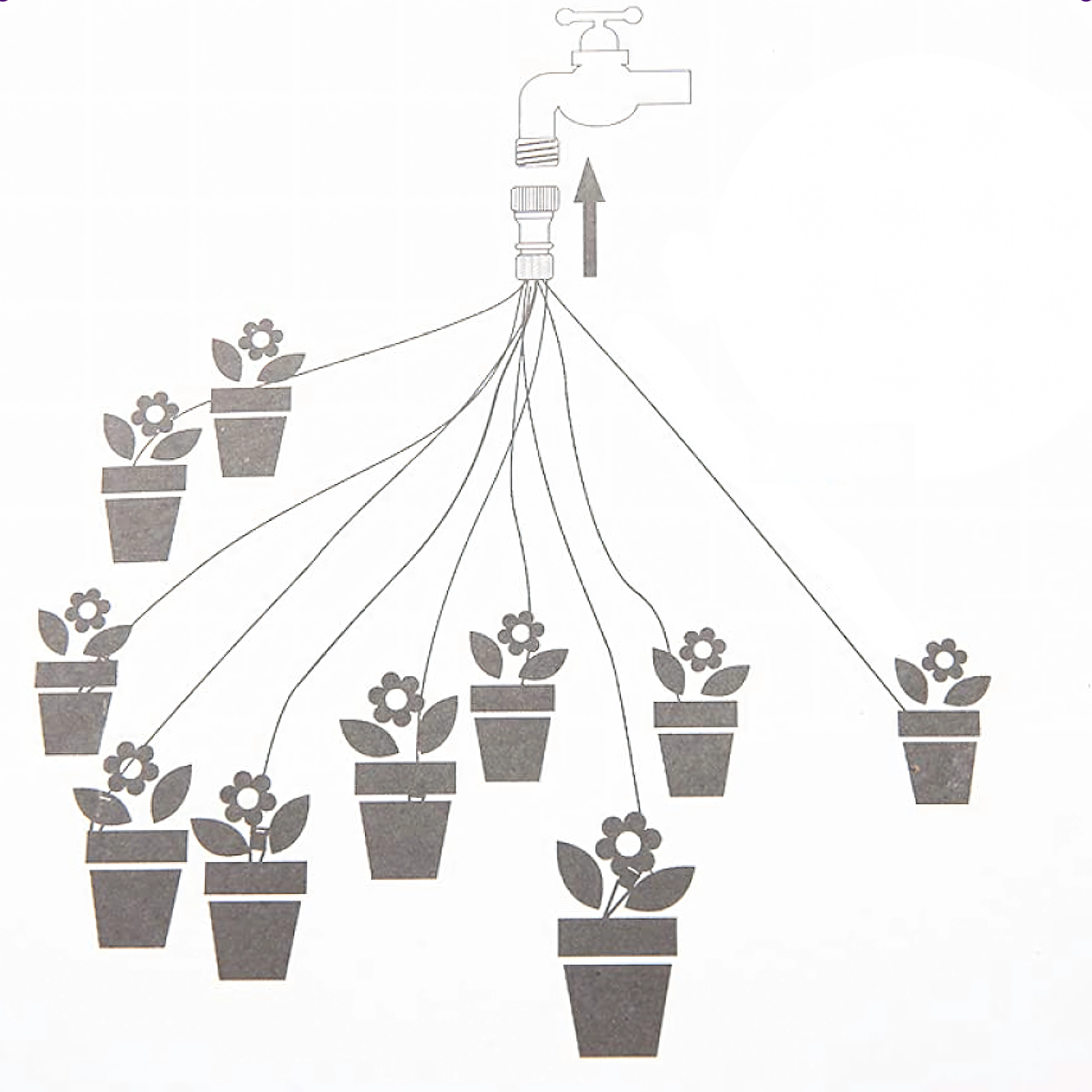 Un répartiteur pratique et des tuyaux souples distribuent l’eau d’une seule source vers plusieurs pots ou massifs simultanément – idéal pour les balcons et les serres.