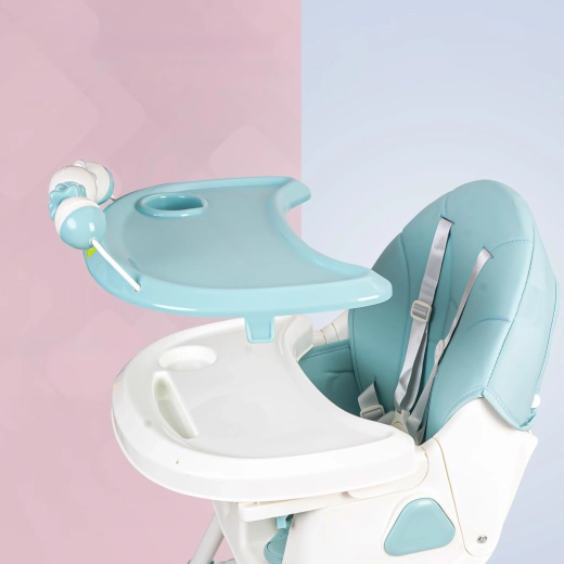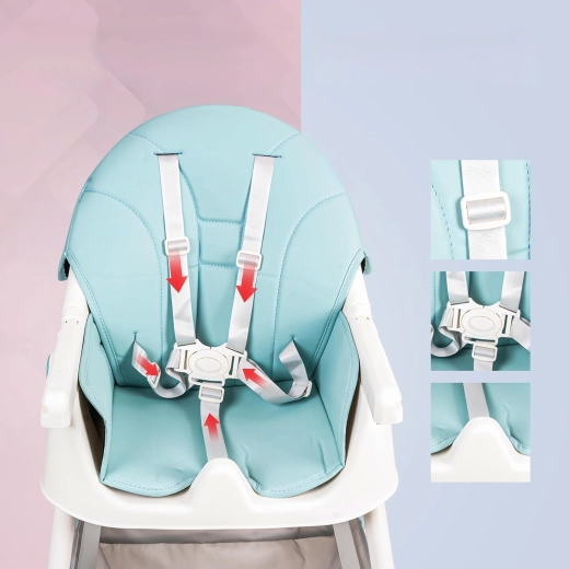 Une assise profilée, un rembourrage moelleux, une sangle 5 points et une butée d’entrejambe maintiennent l’enfant de façon stable et confortable pendant les repas et les jeux.
