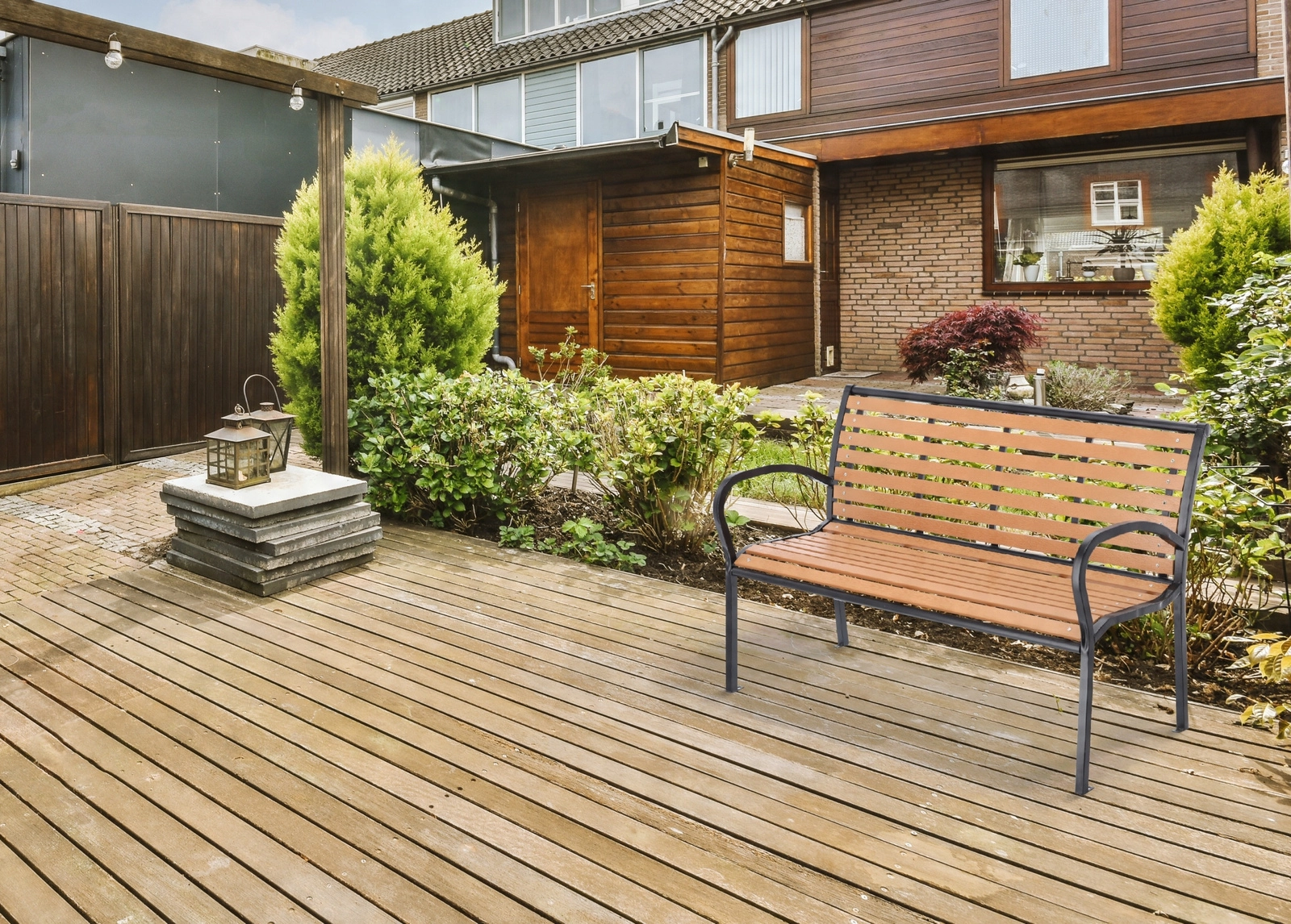 Les lattes en plastique au décor marron ont l’apparence du bois tout en résistant mieux à la pluie et au soleil et ne nécessitent qu’un entretien minimal.