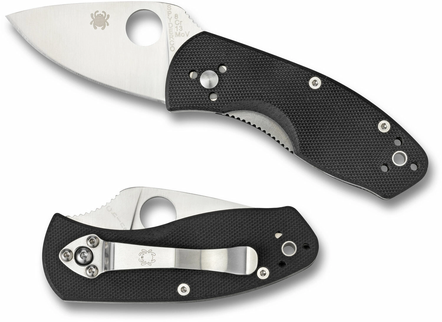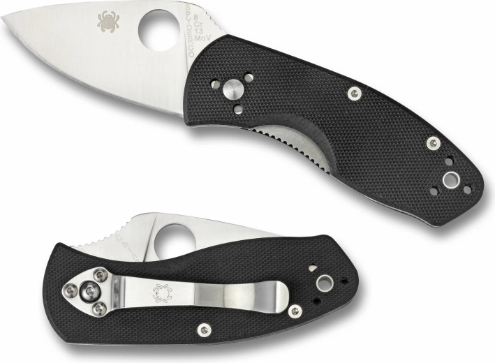 L’ouverture est rapide et intuitive via le trou pour le pouce caractéristique de Spyderco. Le verrou Liner Lock maintient la lame fermement en position de travail. La poignée ergonomique en stratifié G10 noir offre une prise sûre, complétée par un clip pour le port en poche et un trou pour paracorde ou une lanière.