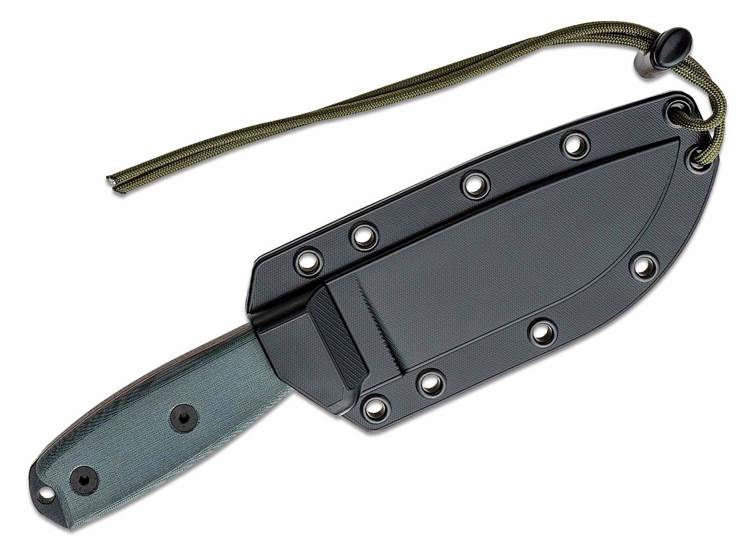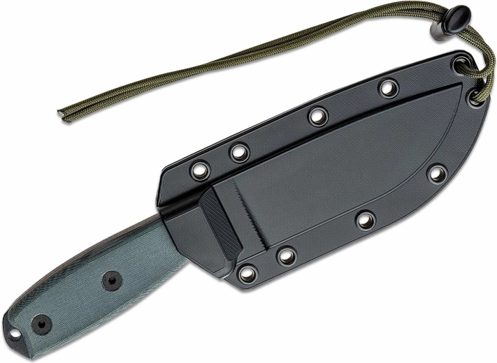Le manche en Micarta gris tient parfaitement en main, assure une prise sûre même dans des conditions difficiles et dispose d’un trou de dragonne en bout. L’ensemble comprend un étui en plastique noir pouvant être fixé à l’équipement, pour garder le couteau toujours à portée de main, en toute sécurité et confort.