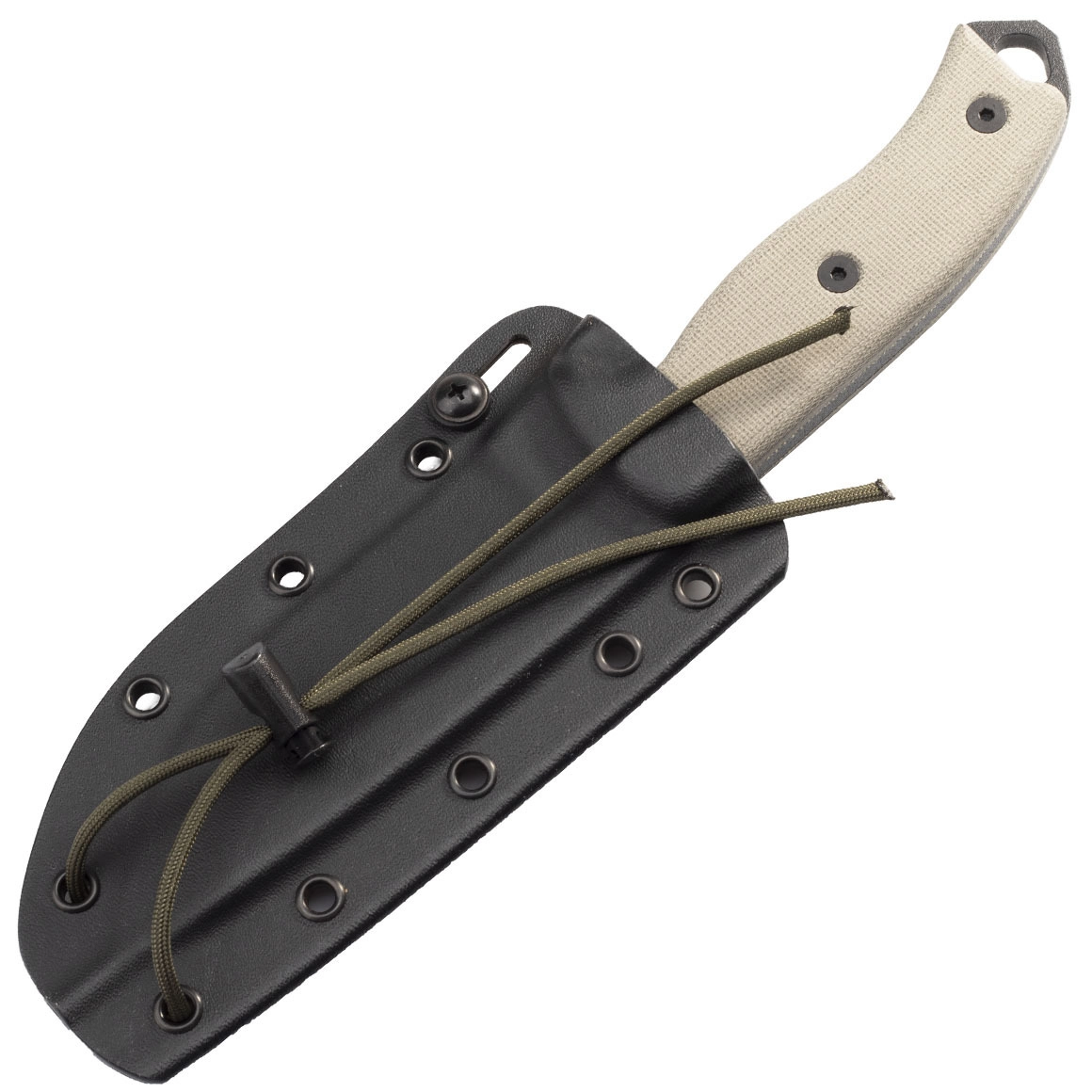 Le manche en canvas micarta est vissé, tient fermement en main et offre une excellente adhérence même humide. On retrouve un jimping prononcé pour le pouce, un trou pour cordon et une pointe brise‑vitre/percuteur en bout. Particularité: une cupule intégrée pour bow‑drill afin d’allumer un feu. Le couteau est complété par un étui Kydex robuste avec œillets multiples pour un port polyvalent.