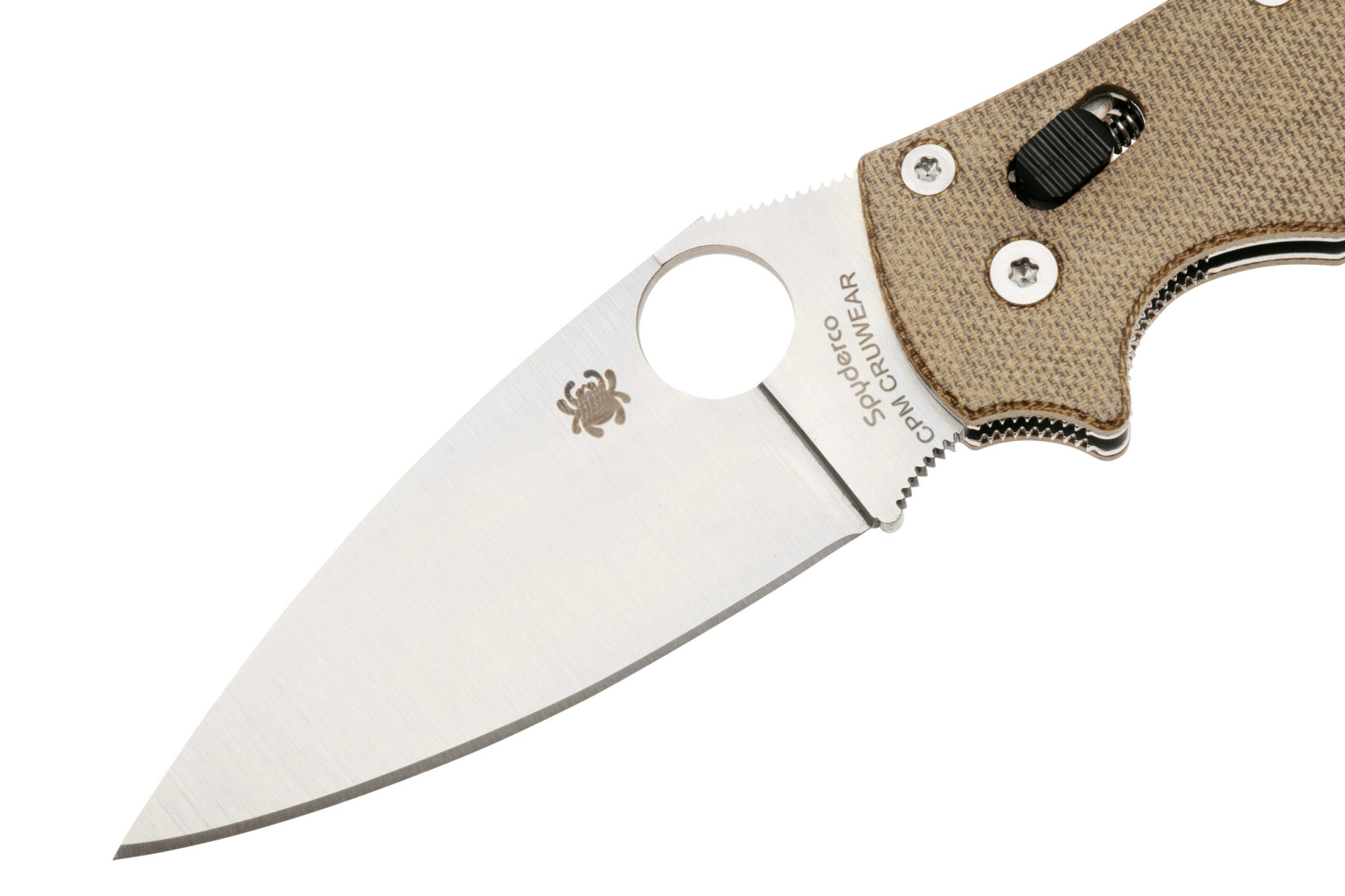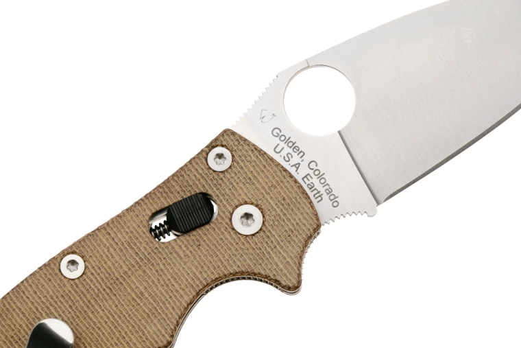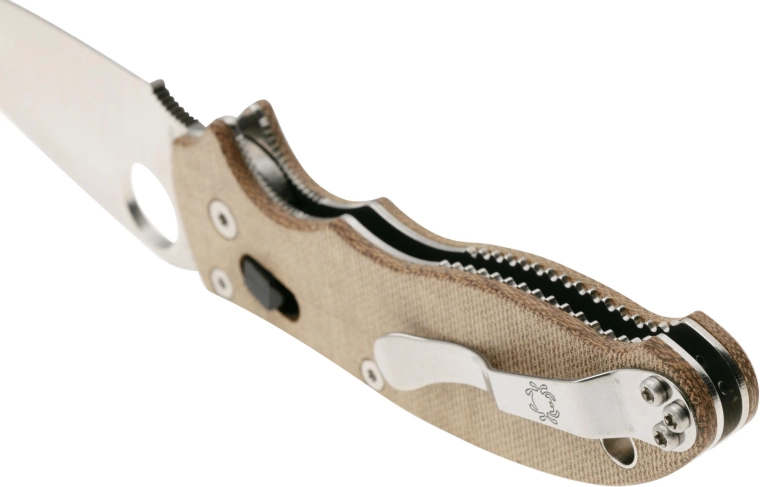 Le trou breveté SpyderHole permet une ouverture rapide et ambidextre, même avec des gants. Le verrou Spyderco Ball Bearing Lock, robuste et onctueux, procure une grande sécurité au travail et reste entièrement ambidextre. Le manche en Canvas Micarta brun est agréablement adhérent, léger et stylé ; le laminage textile apporte un look unique et de la solidité. Le clip de poche réversible convient au port droitier comme gaucher.