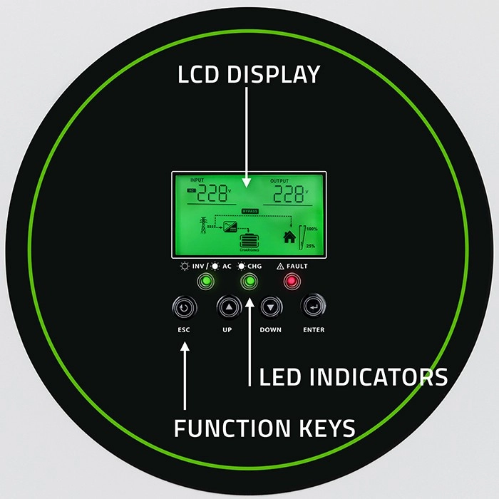L’écran intuitif affiche les tensions, courants et états du système. Il permet de définir la priorité AC/Solaire, la plage de tension d’entrée et le courant de charge selon vos besoins.