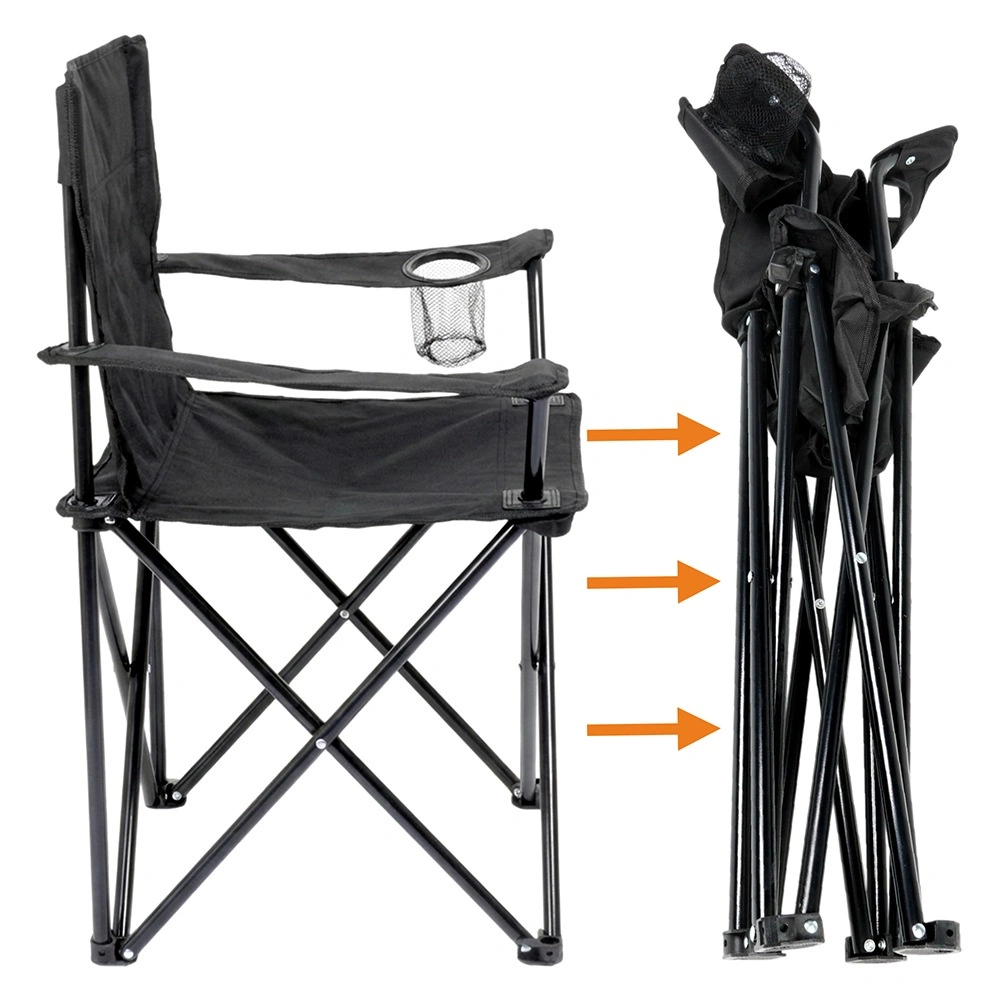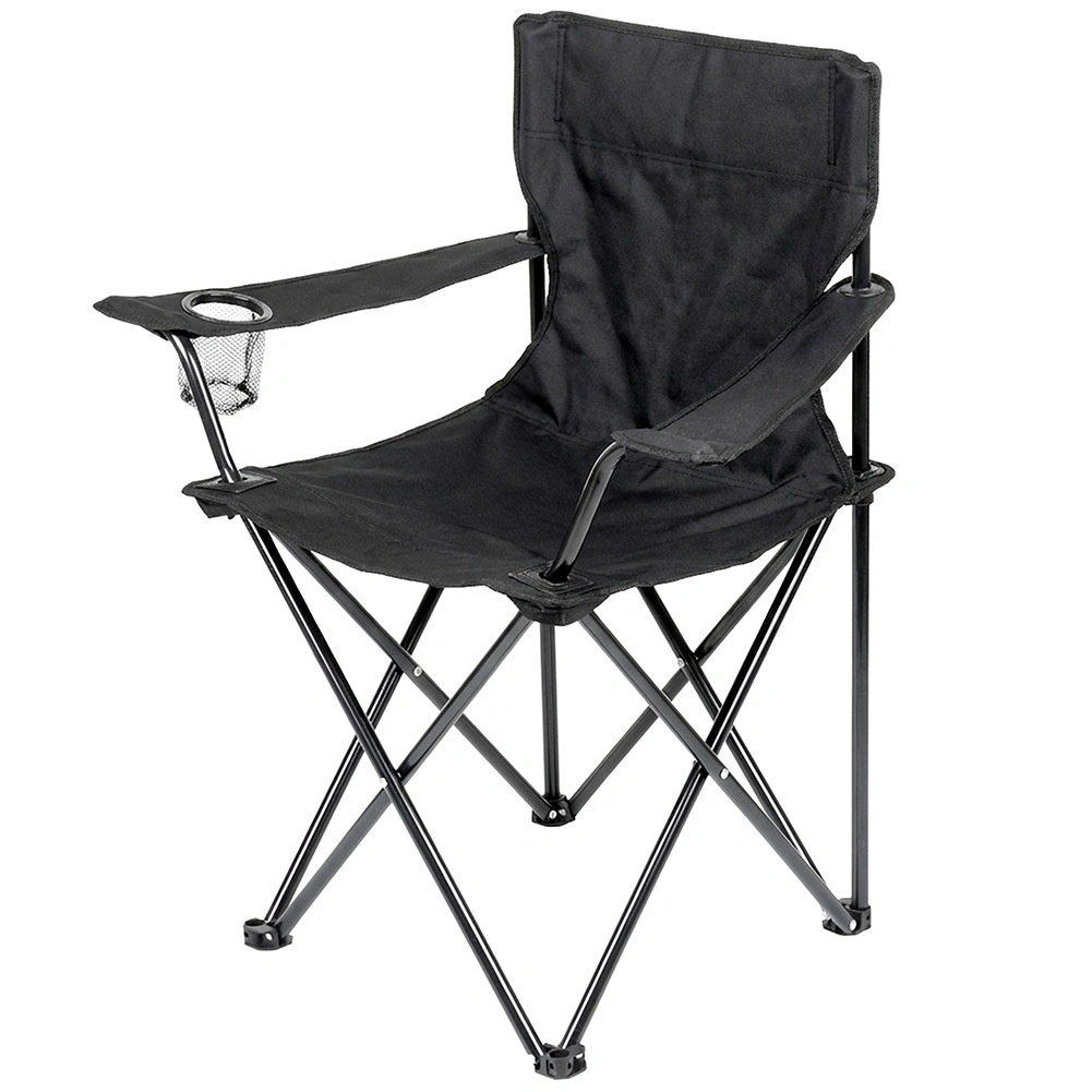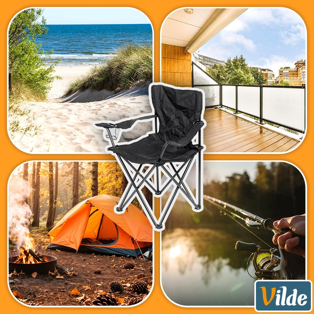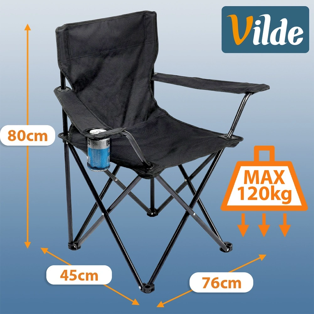 Chaise de camping légère et compacte avec une structure métallique robuste et une housse en polyester résistant de couleur noire. Se plie facilement, se range dans un étui de transport avec sangle et offre des accoudoirs avec porte-gobelet. Idéale pour le camping, la pêche, la plage et le jardin, avec une capacité de charge jusqu’à 120 kg et une résistance aux intempéries.