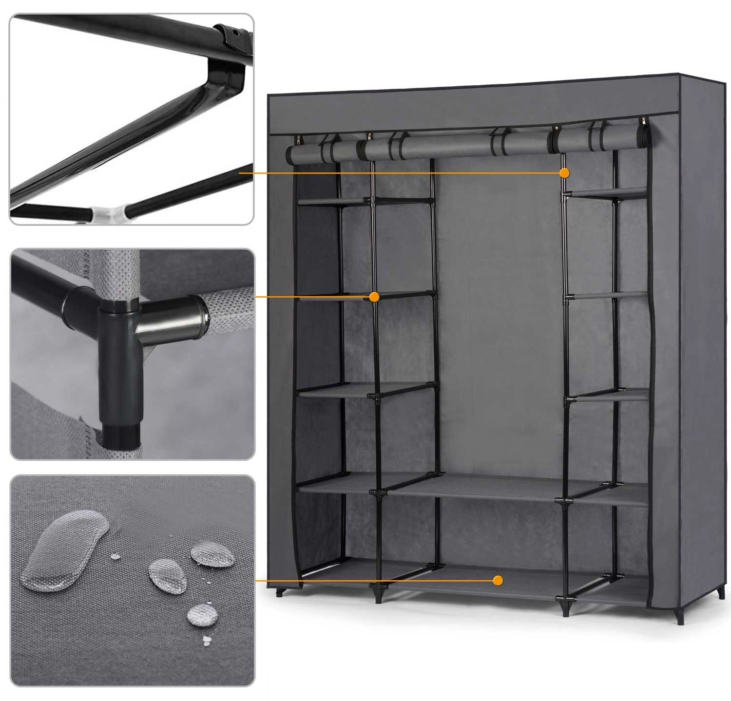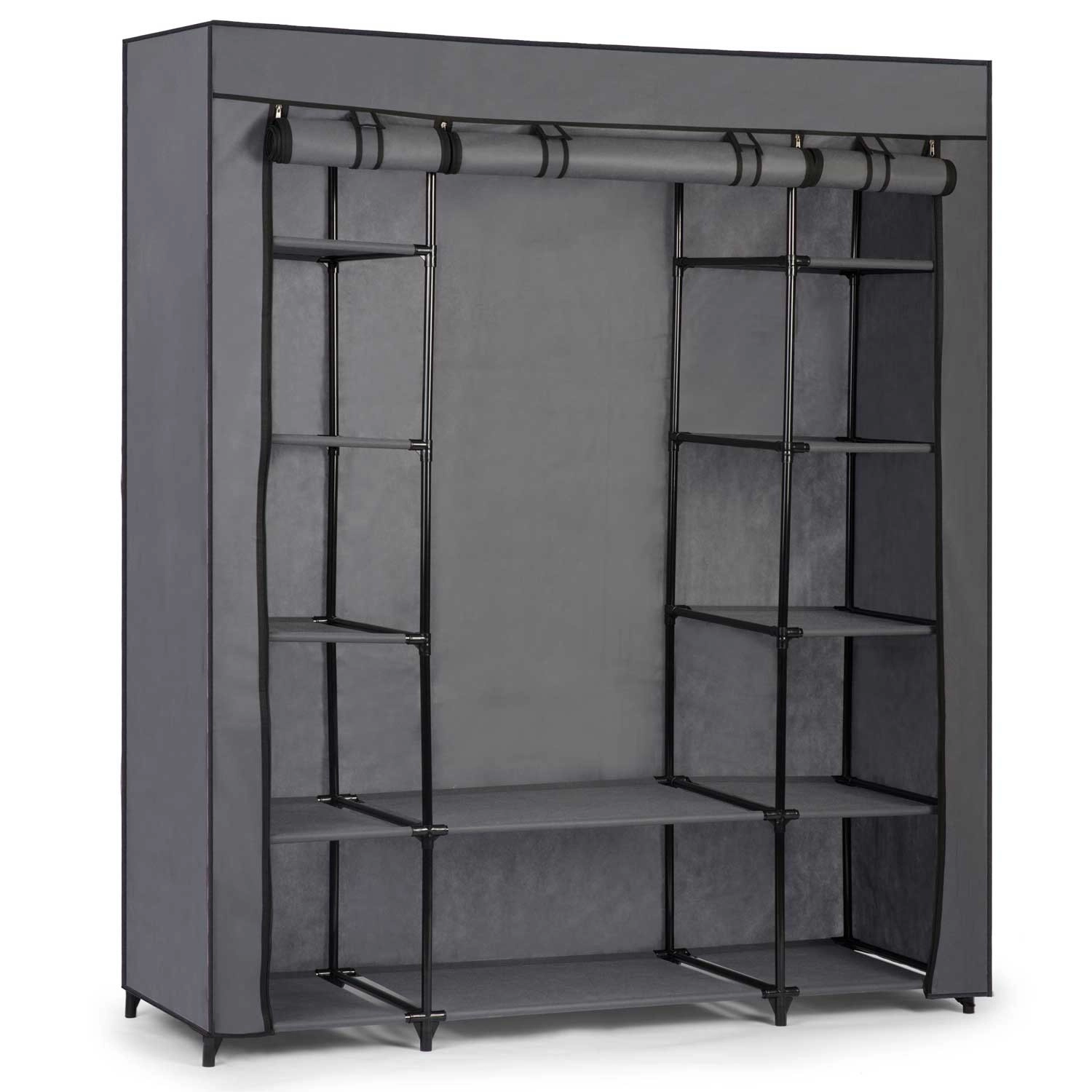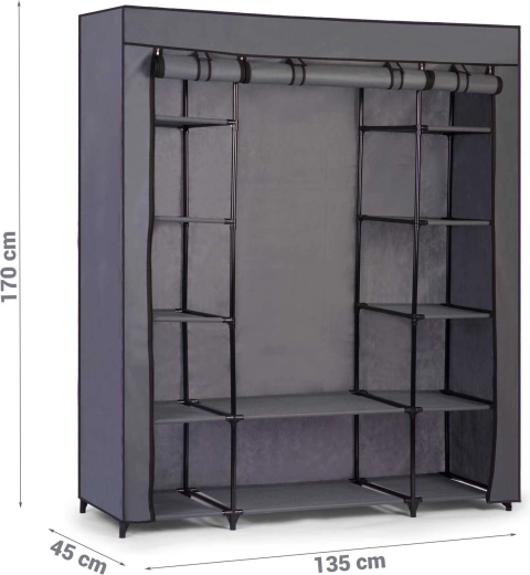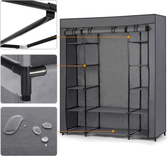 L’armoire propose 12 étagères à capacité renforcée pour le linge plié et les accessoires, ainsi que 1 tringle pour chemises, robes ou vestes. La partie frontale se ferme à l’aide de quatre fermetures éclair de qualité, afin d’ouvrir uniquement la partie dont vous avez besoin. Le montage est rapide et intuitif – sans outils spécifiques et en quelques minutes.