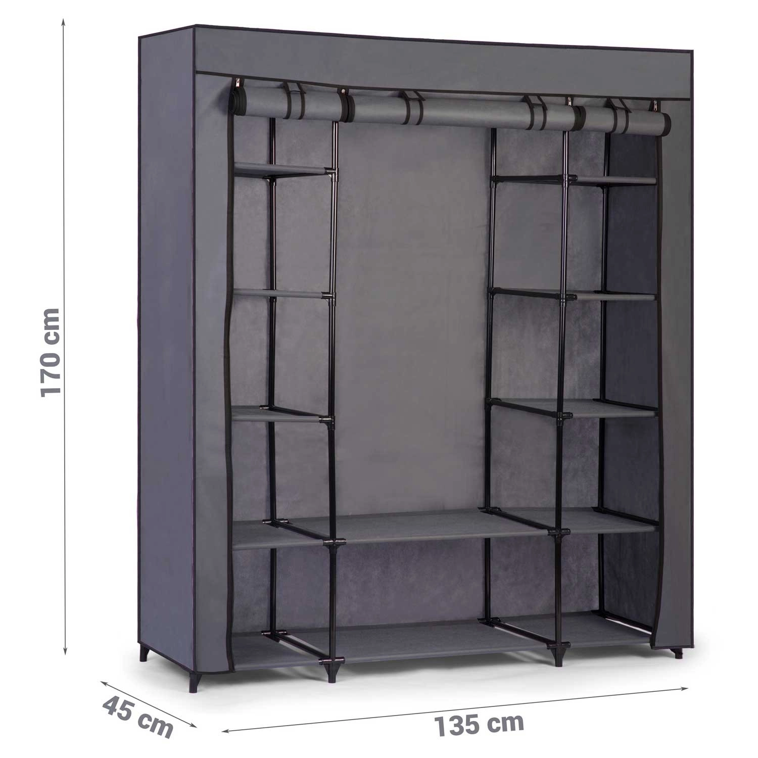 Pratique et spacieuse, la armoire textile Massido en coloris graphite offre 12 étagères robustes, une tringle pour cintres et un cadre en acier pour une haute stabilité. Trois sections séparées avec leurs propres portes et quatre fermetures éclair garantissent un accès aisé et un rangement organisé. Son matériau imperméable et son montage simple et intuitif font de cette armoire une solution idéale pour la chambre, le dressing et l’entrée.