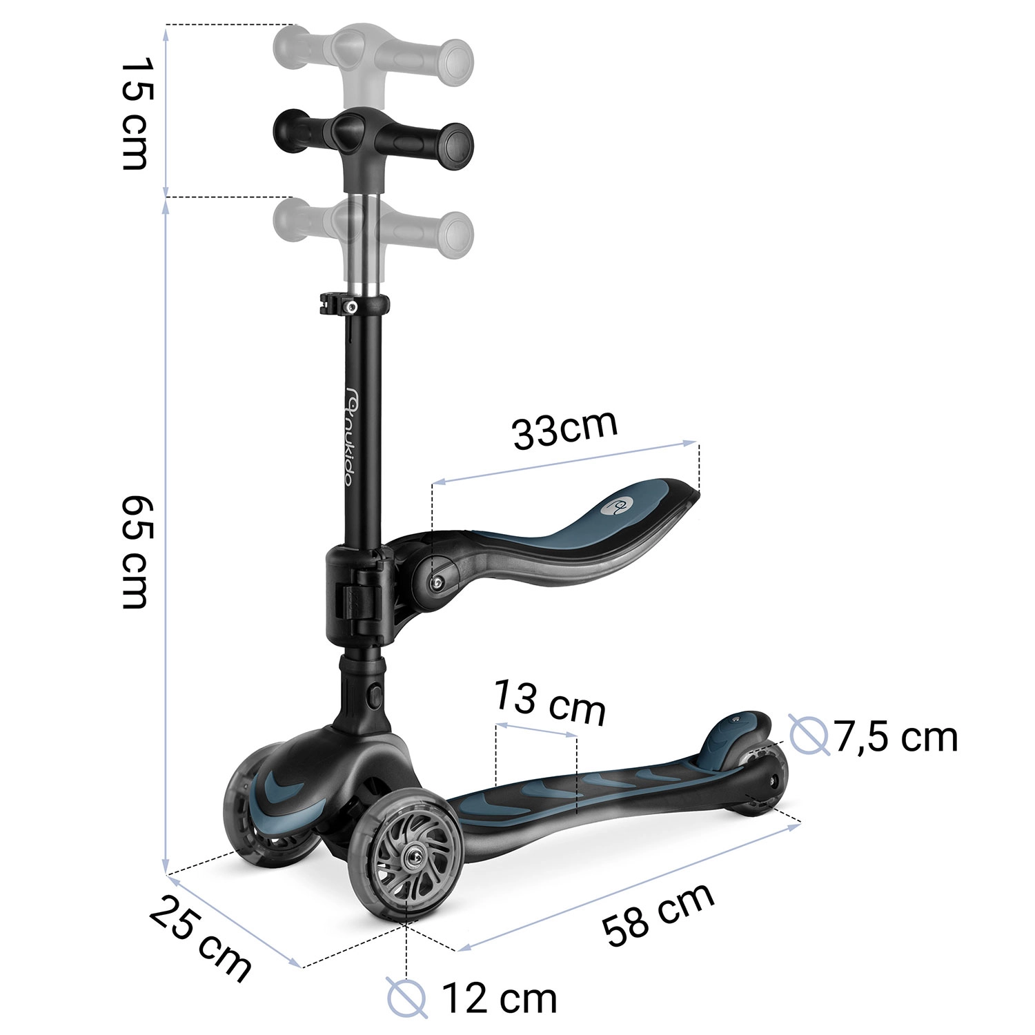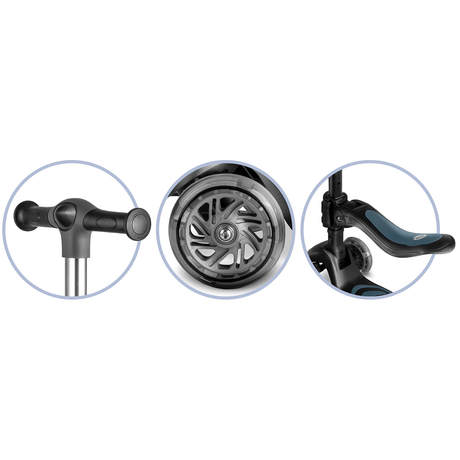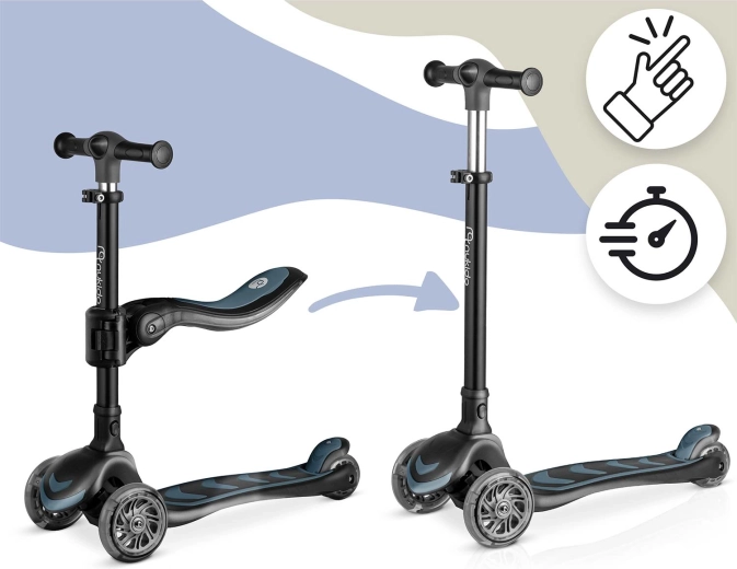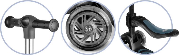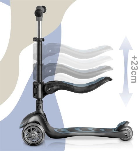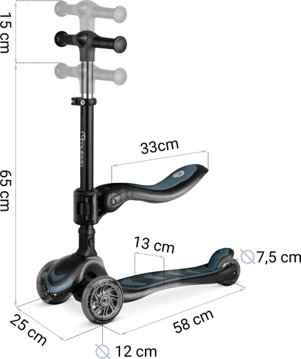 Le réglage en trois positions de la hauteur du guidon et le siège réglable et amovible permettent d’adapter la trottinette à la taille et aux compétences actuelles de l’enfant.