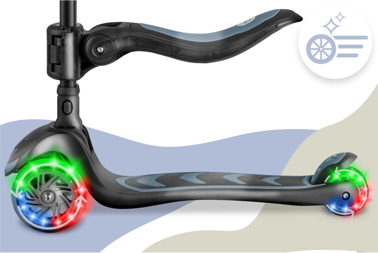 Des détails pratiques comme l’éclairage LED des roues (dynamo sans piles), le plateau large antidérapant et le frein arrière puissant apportent confort et sécurité. Le guidon et le siège réglables en hauteur évoluent avec l’enfant, la poignée en aluminium légère facilite le pilotage et la construction résistante garantit une utilisation durable.