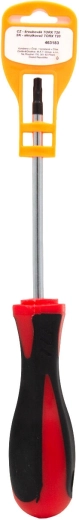 Tournevis Torx T20 professionnel en acier S2 robuste avec pointe magnétique pour une tenue sûre des vis. Il offre une poignée ergonomique bi-matière en caoutchouc TPR pour une prise en main confortable et un trou pour levier afin d’augmenter la transmission de force.