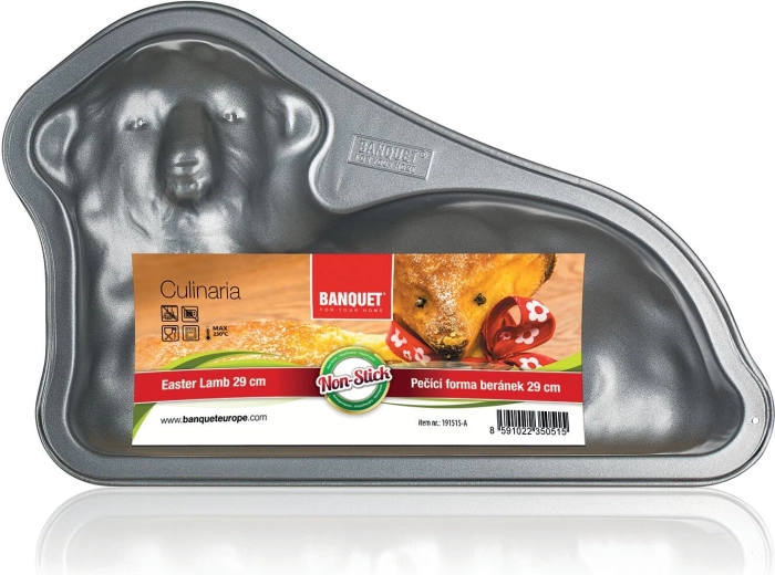Réalisez un agneau de Pâques spectaculaire avec le moule CULINARIA de 29,3 × 19,2 × 7,6 cm. La tôle d’acier au carbone de 0,5 mm d’épaisseur garantit stabilité et cuisson uniforme, tandis que le revêtement XYNFLON à base de PTFE protège contre l’adhérence et permet un démoulage rapide du dessert.
