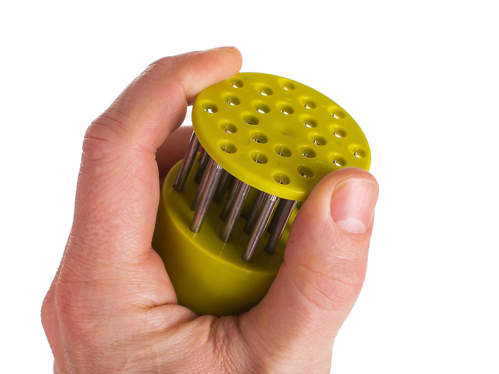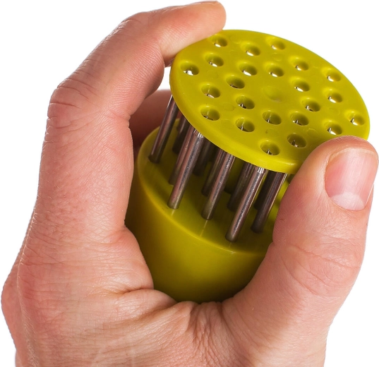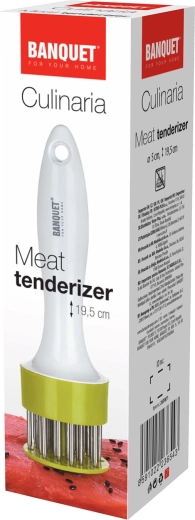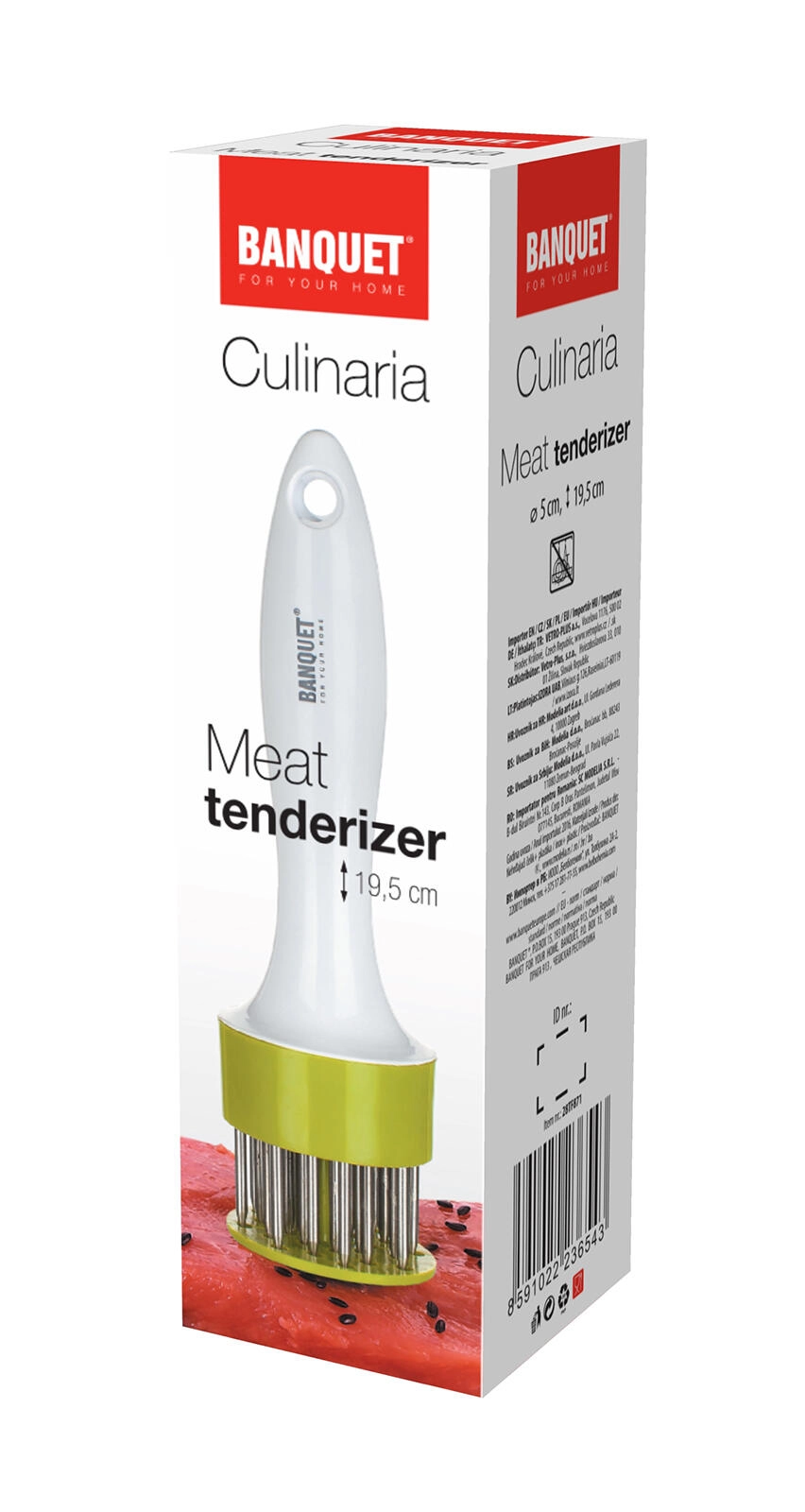 L’attendrisseur de viande Culinaria est l’outil idéal pour la cuisine quotidienne comme pour la préparation de plats de fête. Le champ dense d’aiguilles en acier inoxydable aère et incise les fibres musculaires, garantissant une cuisson plus uniforme et une bien meilleure absorption des épices et des marinades. Il conviendra à tous ceux qui souhaitent une viande toujours moelleuse et juteuse.