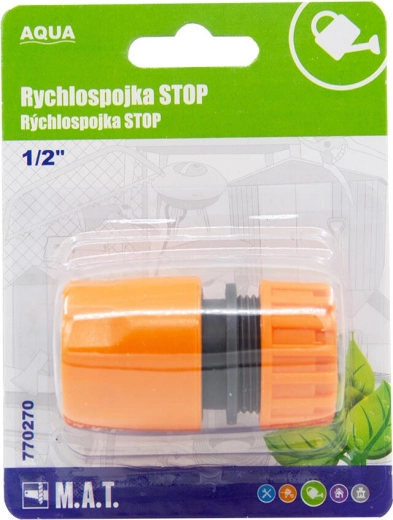 Raccord rapide avec clapet d’arrêt 1/2" AQUA pour un branchement facile et rapide du tuyau d’arrosage. Le clapet d’arrêt ferme automatiquement le débit lors du débranchement des accessoires, donc aucune éclaboussure inutile. Conception robuste et étanchéité fiable pour un arrosage sans problème.