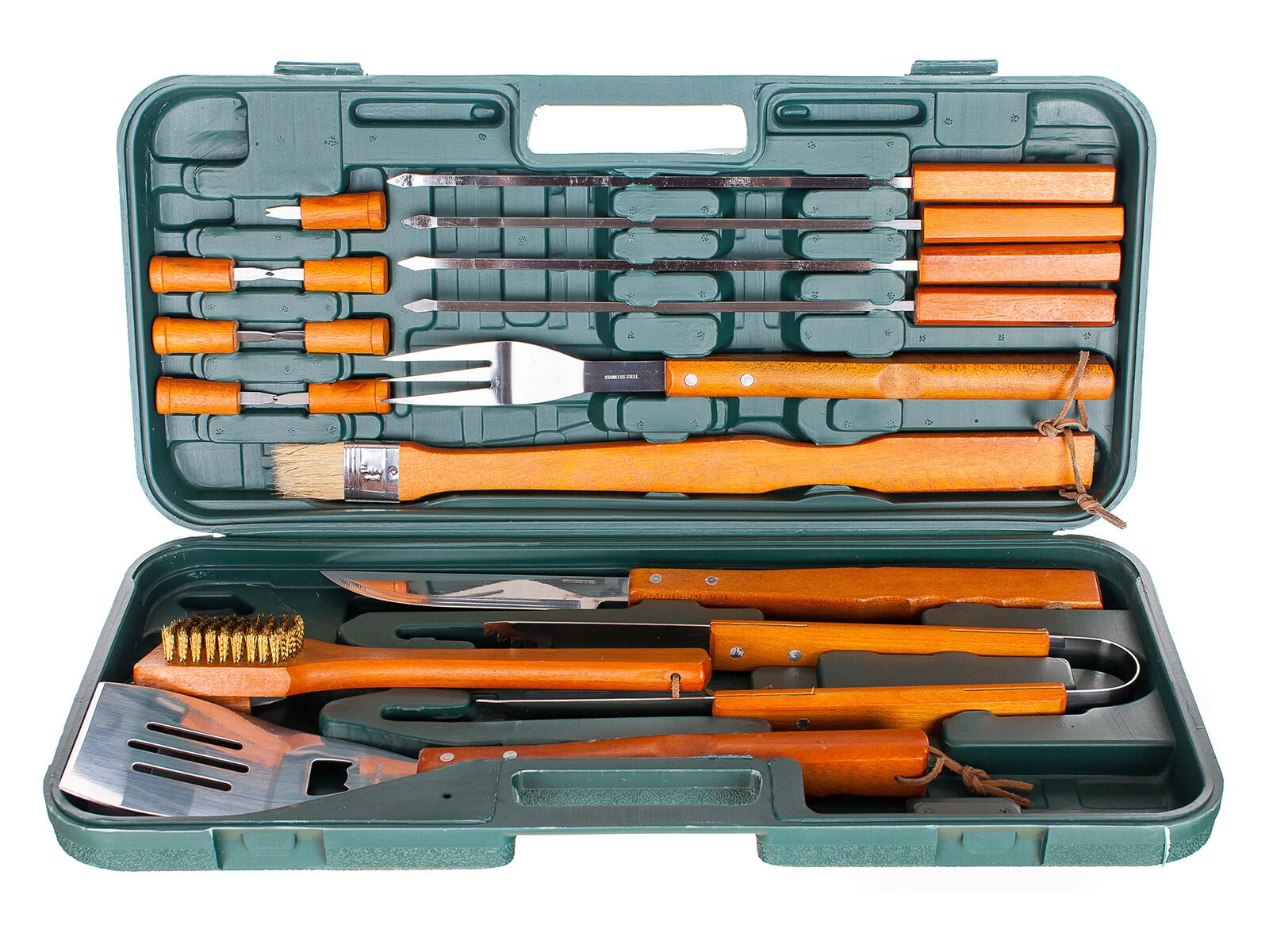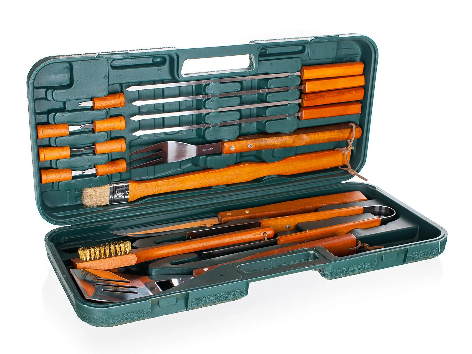 Ce set universel de 18 pièces pour barbecue offre tout, de la spatule et des pinces jusqu’aux broches et piques. Les outils en acier inoxydable de qualité, dotés de longues poignées en bois, assurent une prise sûre et un confort optimal au-dessus de la chaleur. Tout l’équipement est rangé de manière claire dans une mallette en plastique résistante, qui facilite le transport et le stockage.