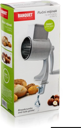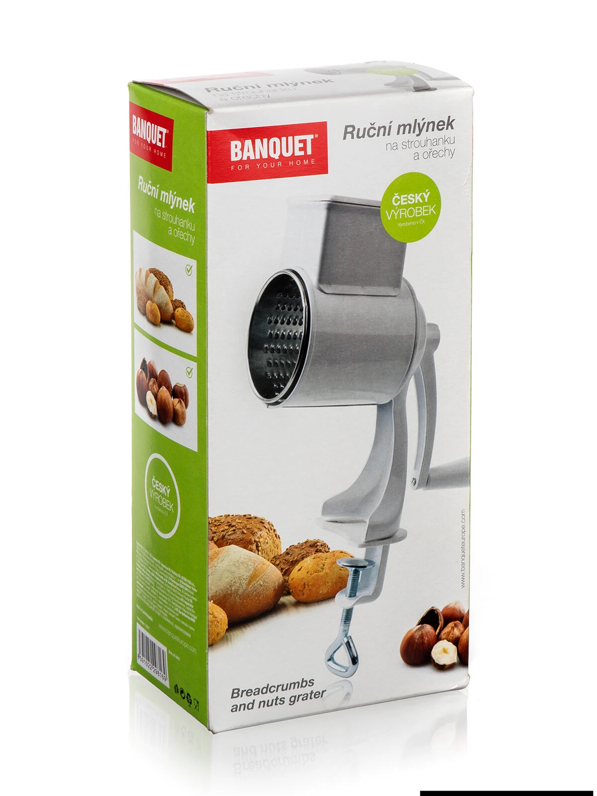 Le moulin manuel à chapelure BANQUET est idéal pour un usage quotidien – de la chapelure fine à partir de pain au râpage rapide de fromages durs et de noix. Un corps métallique avec finition résistante et un tambour étamé garantissent longévité et entretien aisé.