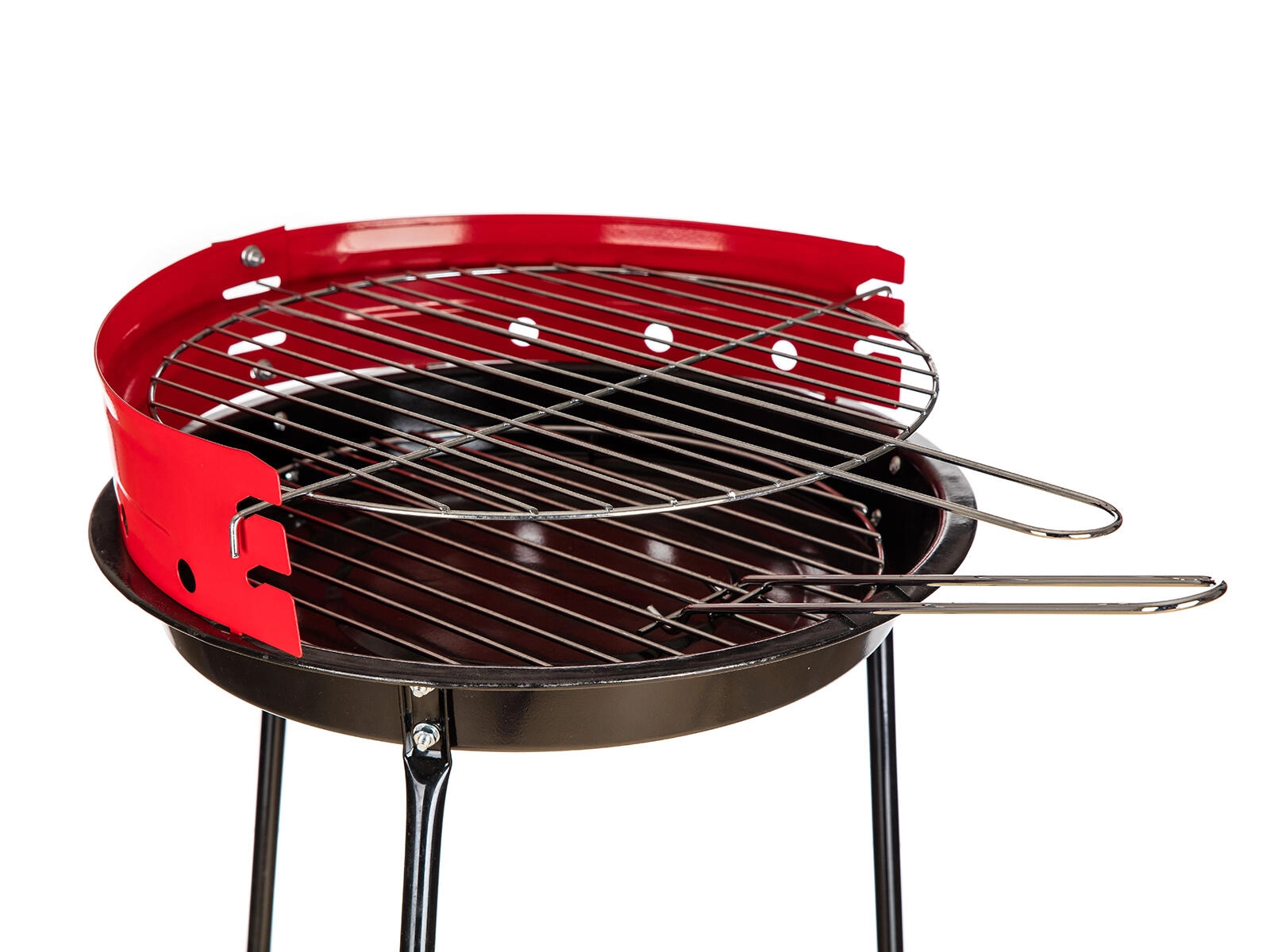 Deux grilles chromées et un pare-vent rouge favorisent une cuisson homogène et protègent des rafales de vent.