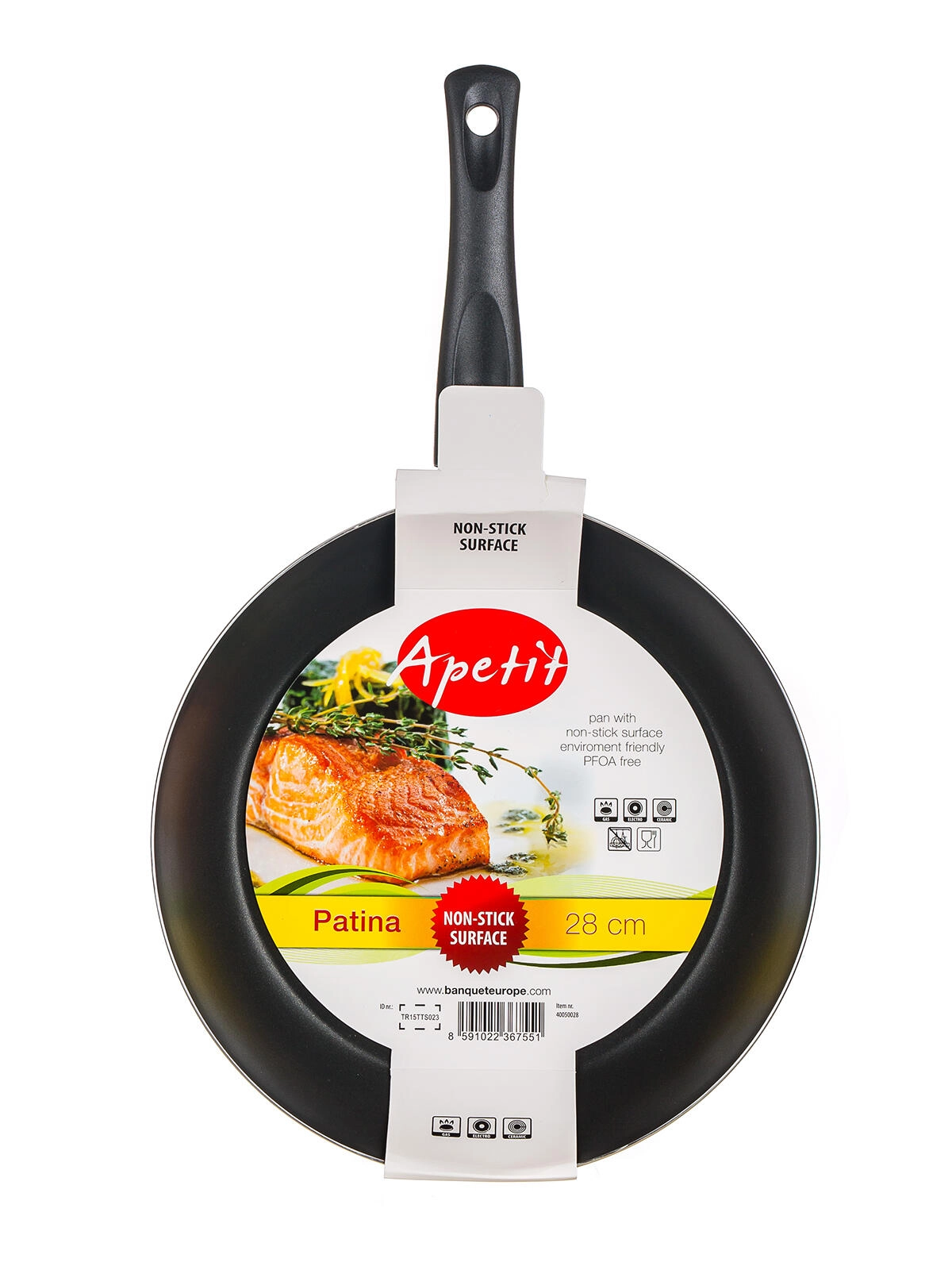 Poêle PATINA légère et résistante, diamètre 28 cm, avec un revêtement antiadhésif XYLAN à deux couches et une poignée ergonomique en bakélite pour une cuisine quotidienne confortable. Compatible avec tous les types de plaques sauf l’induction et idéale pour une cuisson saine avec un minimum d’huile.