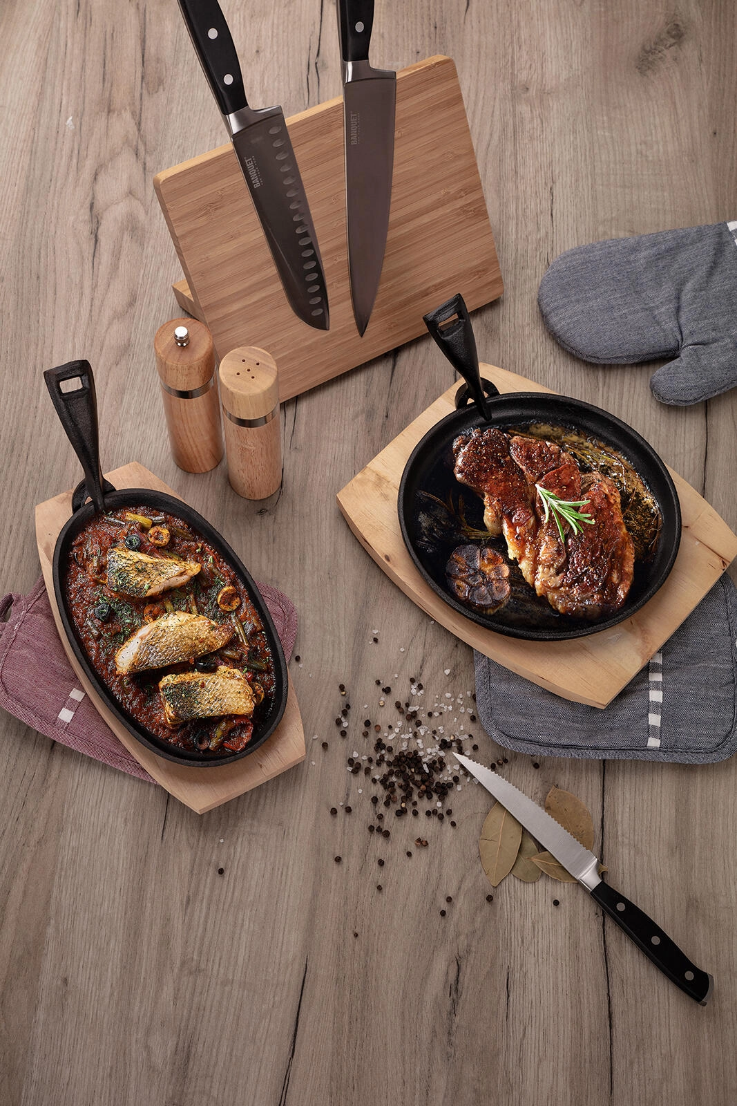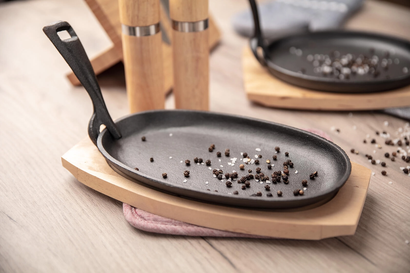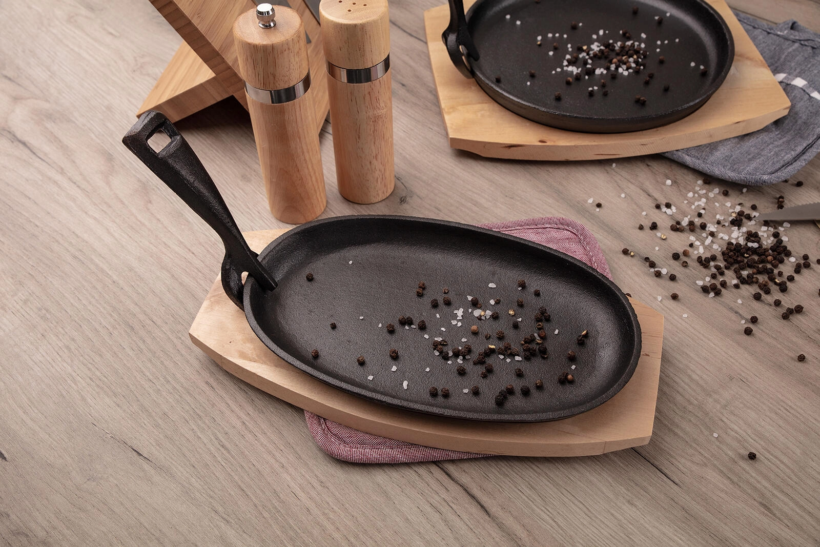 La poêle en fonte conserve la chaleur et, grâce à la planche en bois, vous la transportez en toute sécurité jusqu’à la table – le plat reste chaud et délicieusement grésillant.