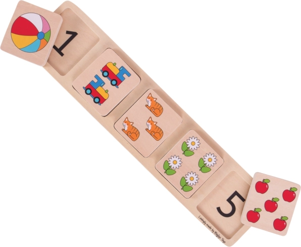 Faites découvrir aux plus petits les nombres 1–5 avec ce puzzle d’encastrement en bois de Bigjigs Toys. Les enfants associent les pièces illustrées au bon chiffre sur la planche et développent naturellement le comptage, la motricité fine et la coordination œil-main. De grandes pièces solides, faciles à saisir, une conception sûre et une impression de qualité favorisent la concentration ainsi que la reconnaissance des formes et des couleurs.