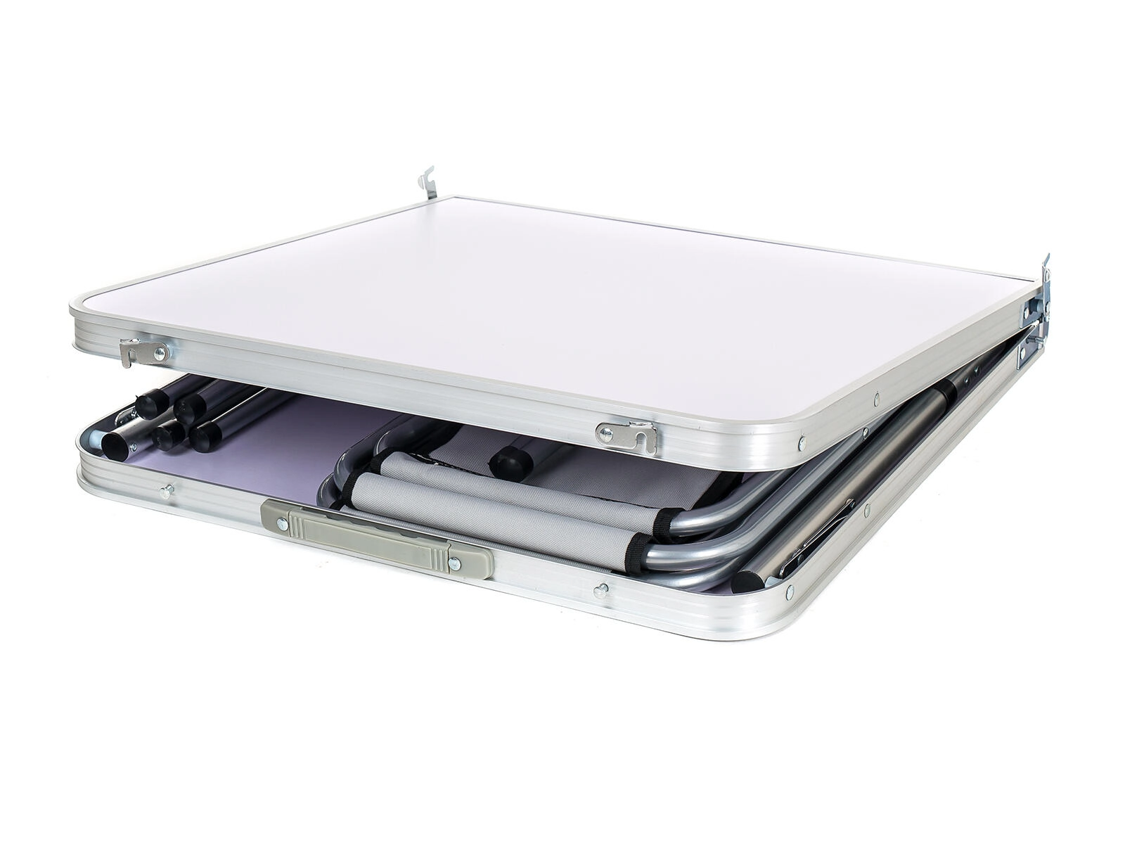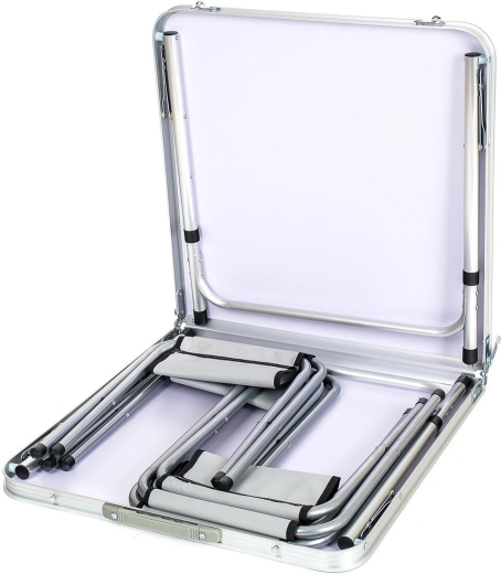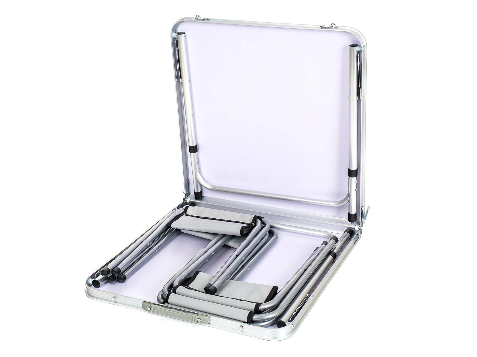 L’ensemble se plie en un rien de temps dans une valisette compacte de 62 × 7,5 × 63 cm avec poignée pour un transport confortable. Sa construction légère mais robuste et les embouts en caoutchouc stables garantissent une utilisation sûre sur diverses surfaces – du camping au pique-nique, jusqu’au balcon ou au jardin.